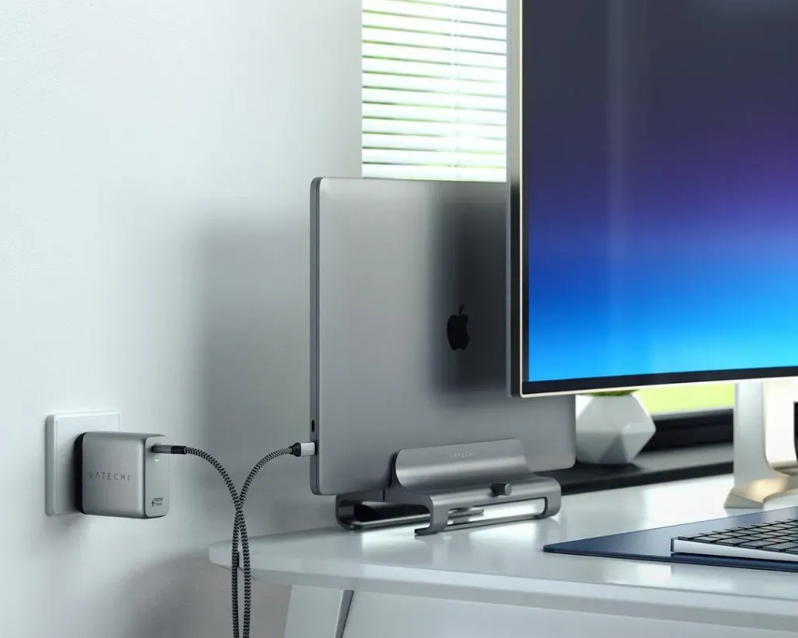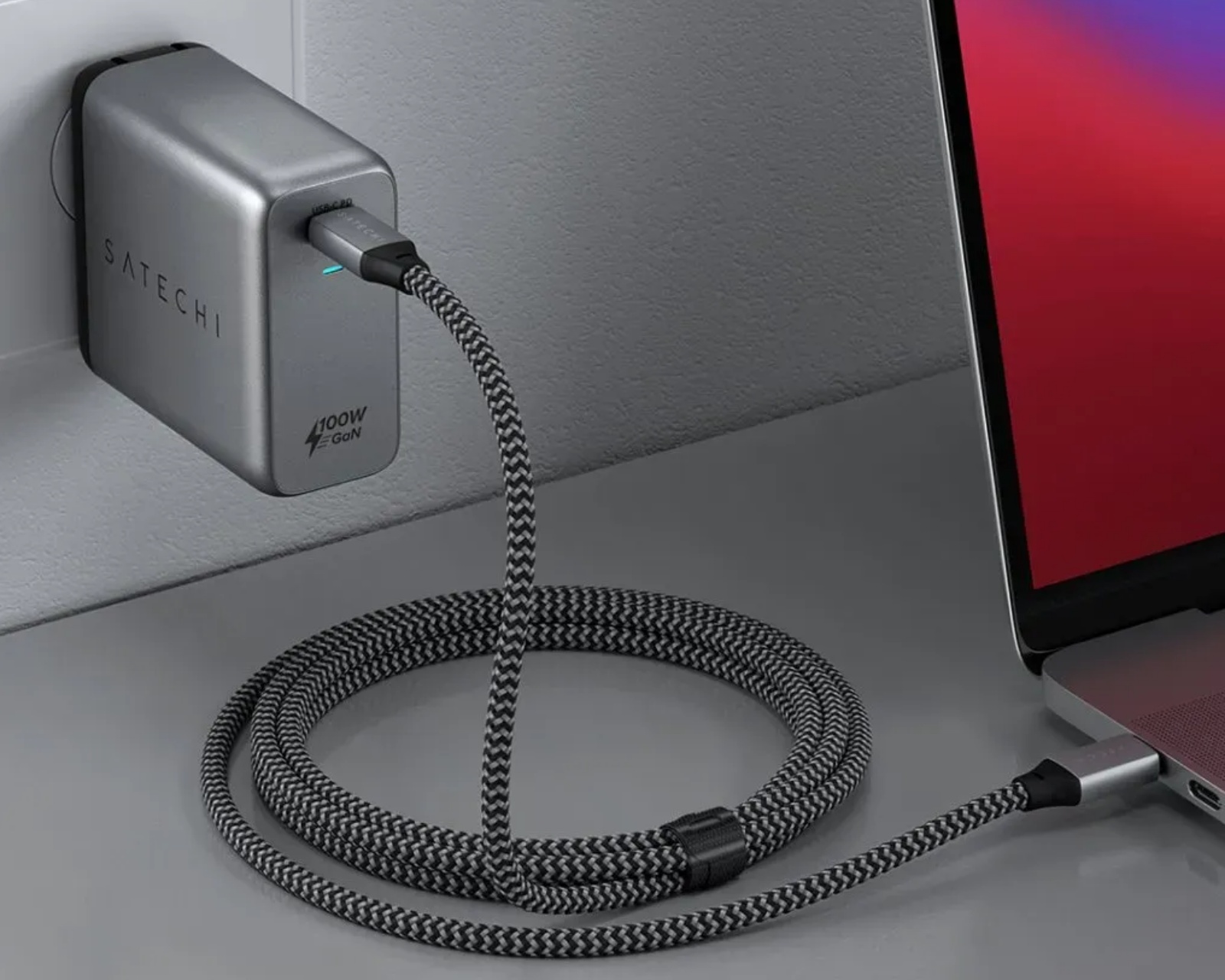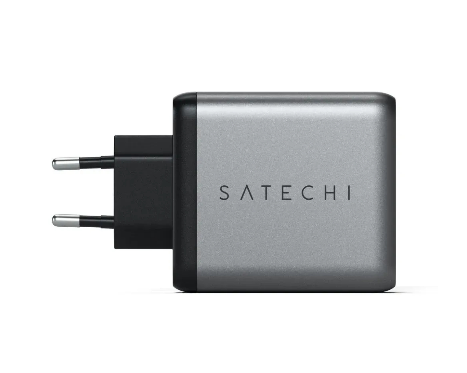 100W PD USB-C Charger is a charger from Satechi that offers high power and fast charging via USB-C. It is designed for use with modern devices, including laptops, smartphones, and other compatible appliances. With a powerful 100W PD option, it can provide sufficient power to charge multiple devices simultaneously, making it ideal for both home and office use.This charger is made with Gallium Nitride (GaN) technology, which makes it more efficient and compact compared to traditional chargers. The GaN material enables higher power transfer while reducing heat generation, thereby increasing the product's lifespan. The charger's design includes integrated safety features, such as overcharge protection and short circuit protection. Weighing 400g and sized for portability, it is easy to take the charger anywhere.