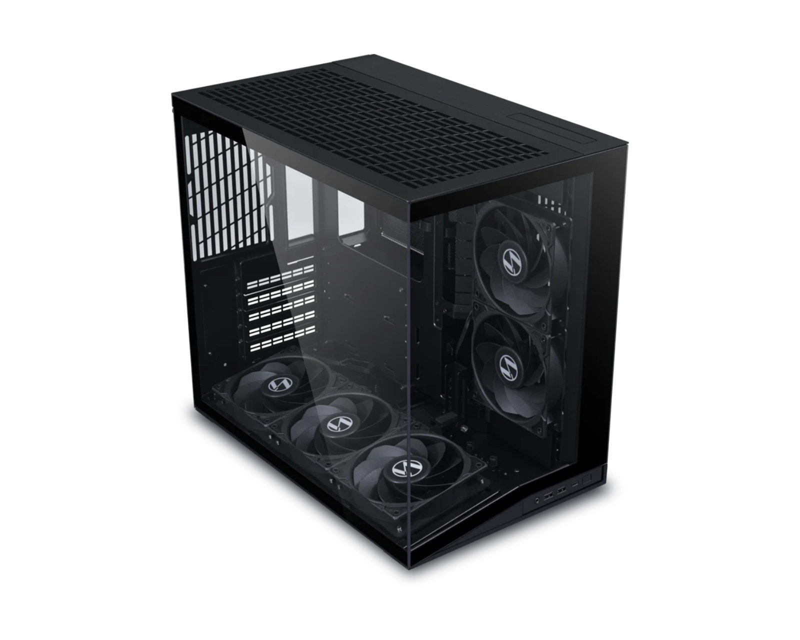 Lian Li O11D Mini V2 Flow is a chassis from Lian Li that offers a spacious interior despite its compact size. It is designed to enable installation of both air and water cooling, and also has the option for vertical mounting of graphics cards. Equipped with tempered glass on the sides and front, it is also easy to showcase your components.Inside the chassis, there is generous space for high-performance hardware, allowing for the installation of graphics cards up to 400 mm. The chassis includes GPU brackets for both vertical and horizontal installation. Clean cable management is ensured through cable holders and support for motherboards with rear connection, which simplifies cable routing. Additionally, seven slots for fans, where five fans (three at the bottom and two with reversed blades on the side) are already installed, allow for effective cooling even under load.