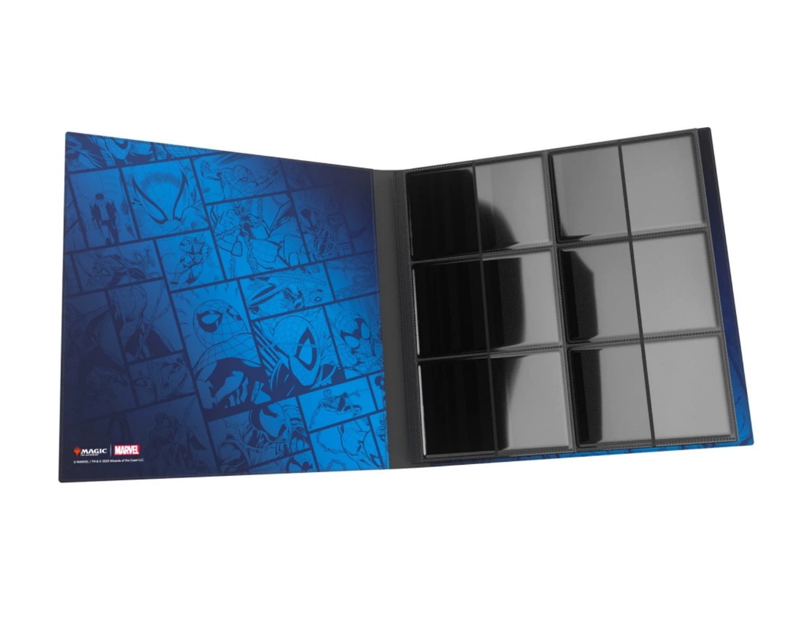 Spider-Man 24-Pocket Album is a collectible album from Magic: The Gathering, specially designed to organize and protect Magic: The Gathering cards. The album can hold up to 480 cards, even with double sleeves, thanks to its 20 pages with 24 side-loading pockets. The colorful cover features high-quality full-art prints that are characteristic of the game.The wide elastic strap and reinforced seams ensure that the contents stay in place and that the album is durable for regular use. The material is of high quality and the pages are black, providing a sleek presentation of the cards. The pockets are designed in rows of four, which optimally supports the arrangement of game sets. With a product size of 310 x 28 x 305 mm, the album is well-suited for both display and storage.