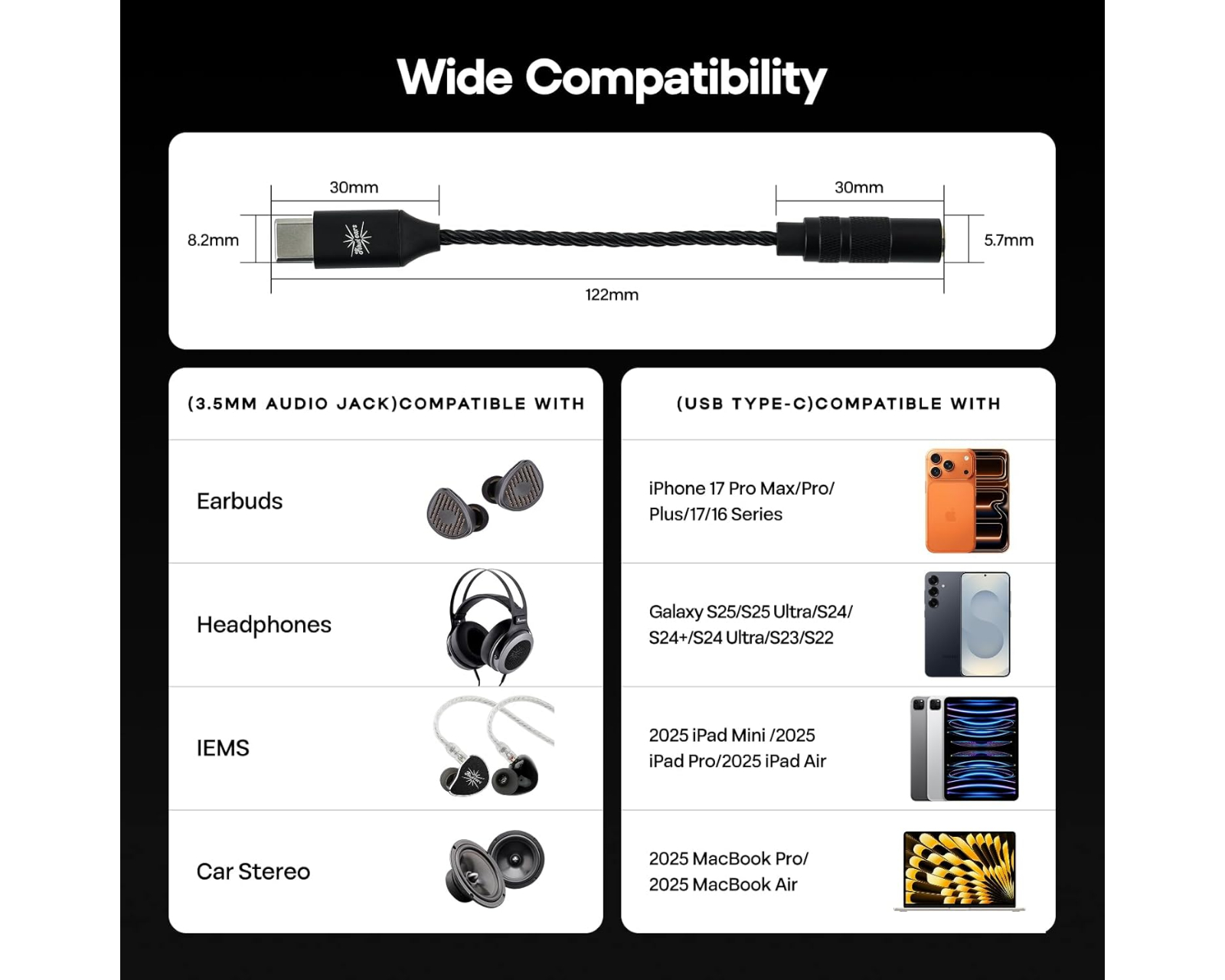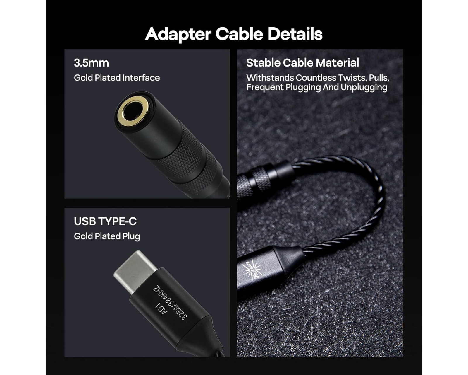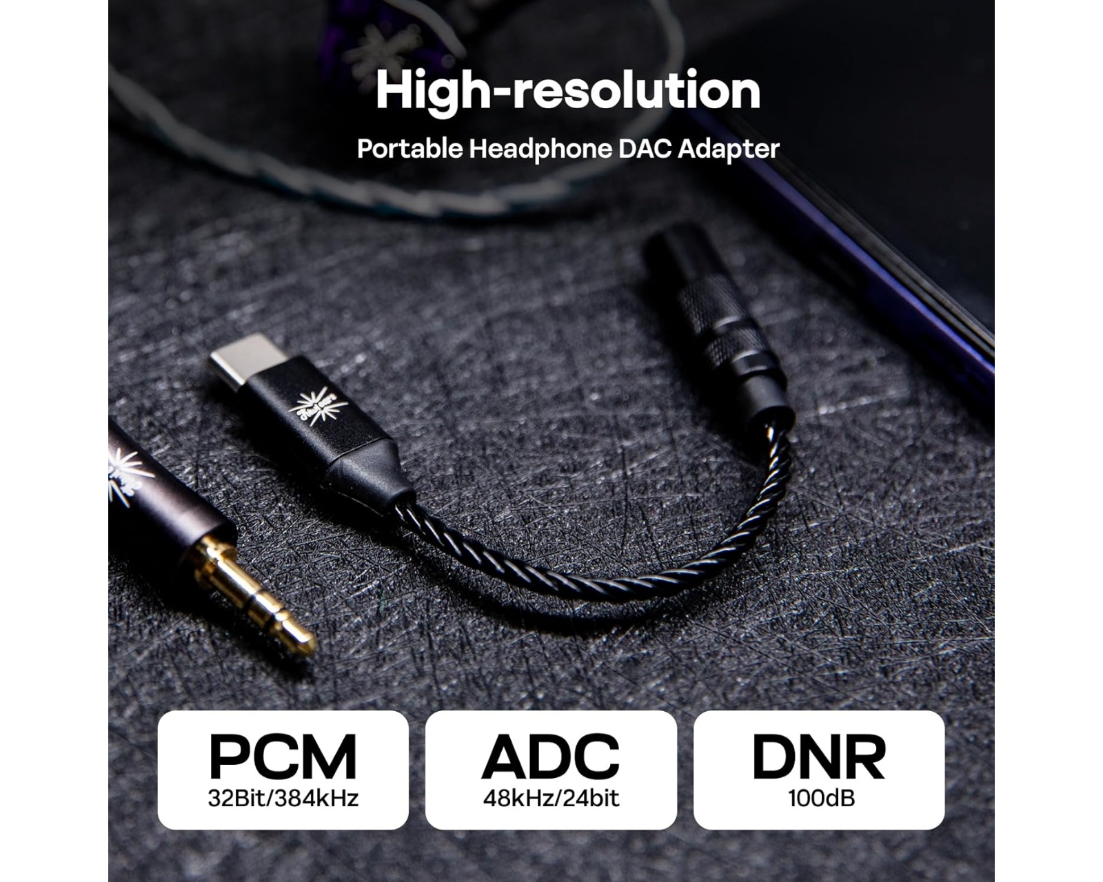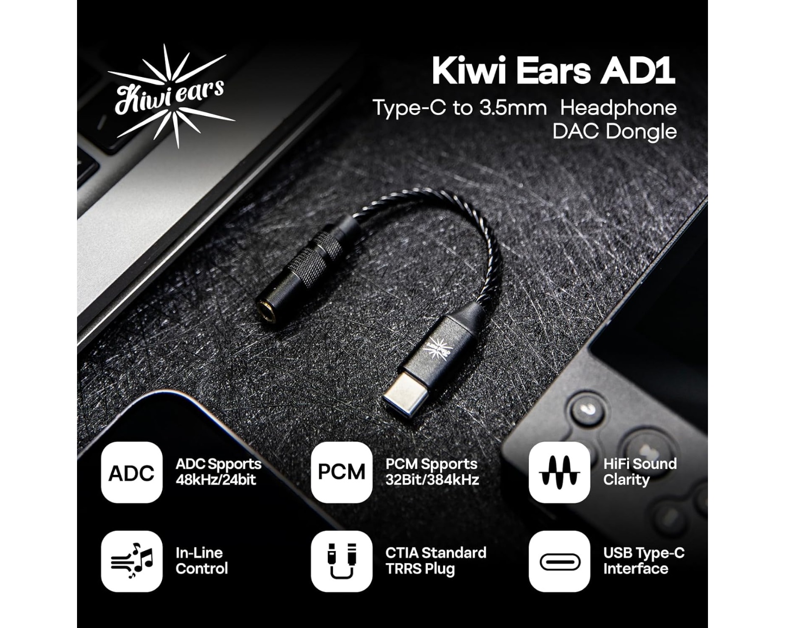 Linsoul Kiwi Ears AD1 is a DAC adapter that enables connection between USB-C devices and headphones with a 3.5 mm jack. It supports high-resolution audio sampling up to 32 bit/384 kHz and utilizes the KT02H20 chip to ensure stable audio decoding. The product is intended for use with headphones, laptops, and smartphones.The adapter cable is constructed with high durability and made from robust materials to withstand repeated connections and disconnections. Metal-coated connectors ensure lossless audio transmission, while CTIA standardization guarantees compatibility with most modern microphones. The device offers a compact design that makes it easy to transport, which is advantageous for both mobile uses and studios.