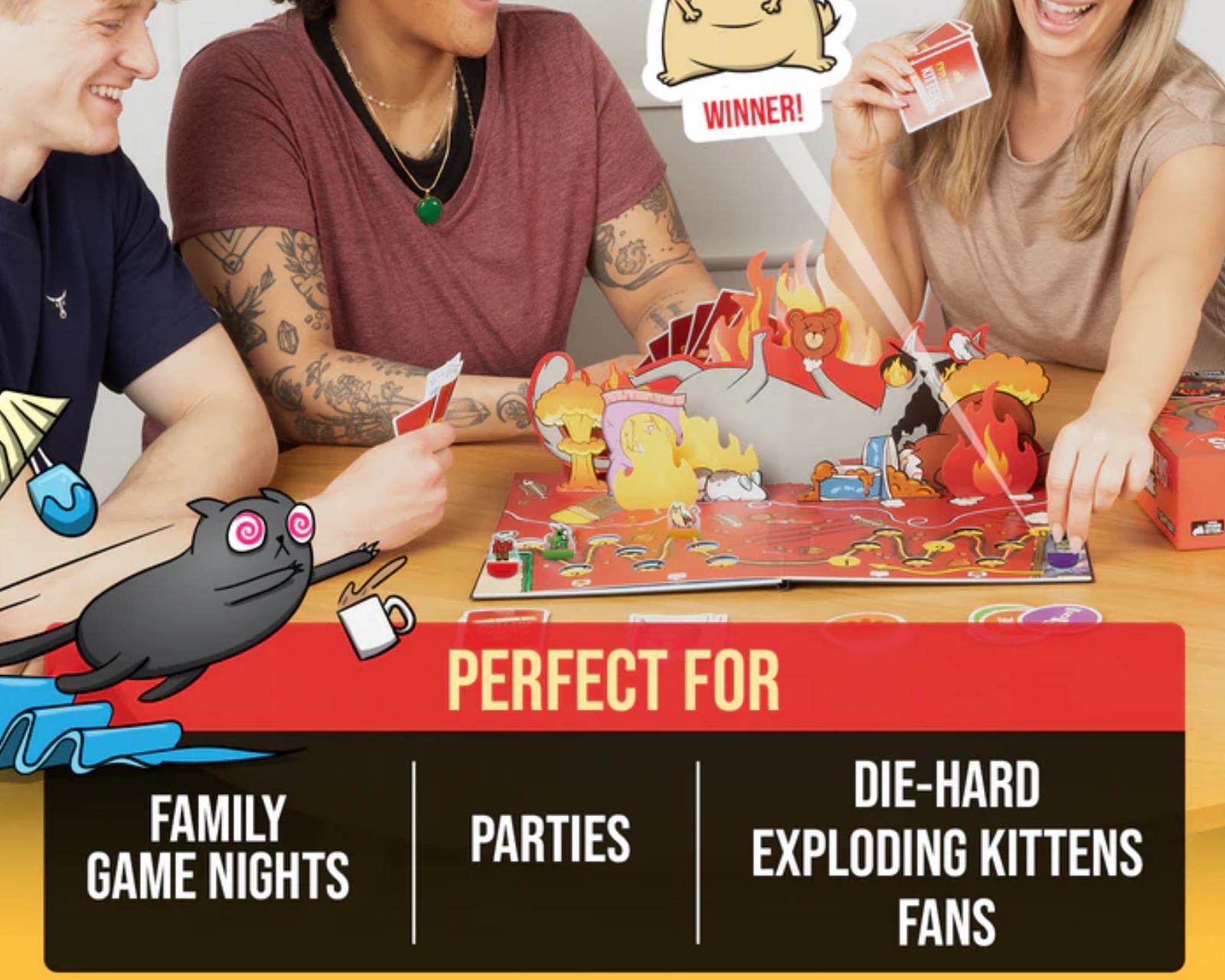 Exploding Kittens: The Board Game - Super Fan Edition is a board game that combines strategy and luck. The game includes special cards, an interactive game board, and unique characters, providing a new dimension to the well-known card version. The target audience includes both new players and fans of the original Exploding Kittens card deck.The board game consists of 65 Action Cards, 26 Movement Cards, 2 exclusive cards, a pop-up game board, and 6 deluxe characters. The interactive board can be flipped, revealing a new game concept and increasing the excitement. The game is designed for 2-5 gamers and is great for game nights where quick rounds are required.