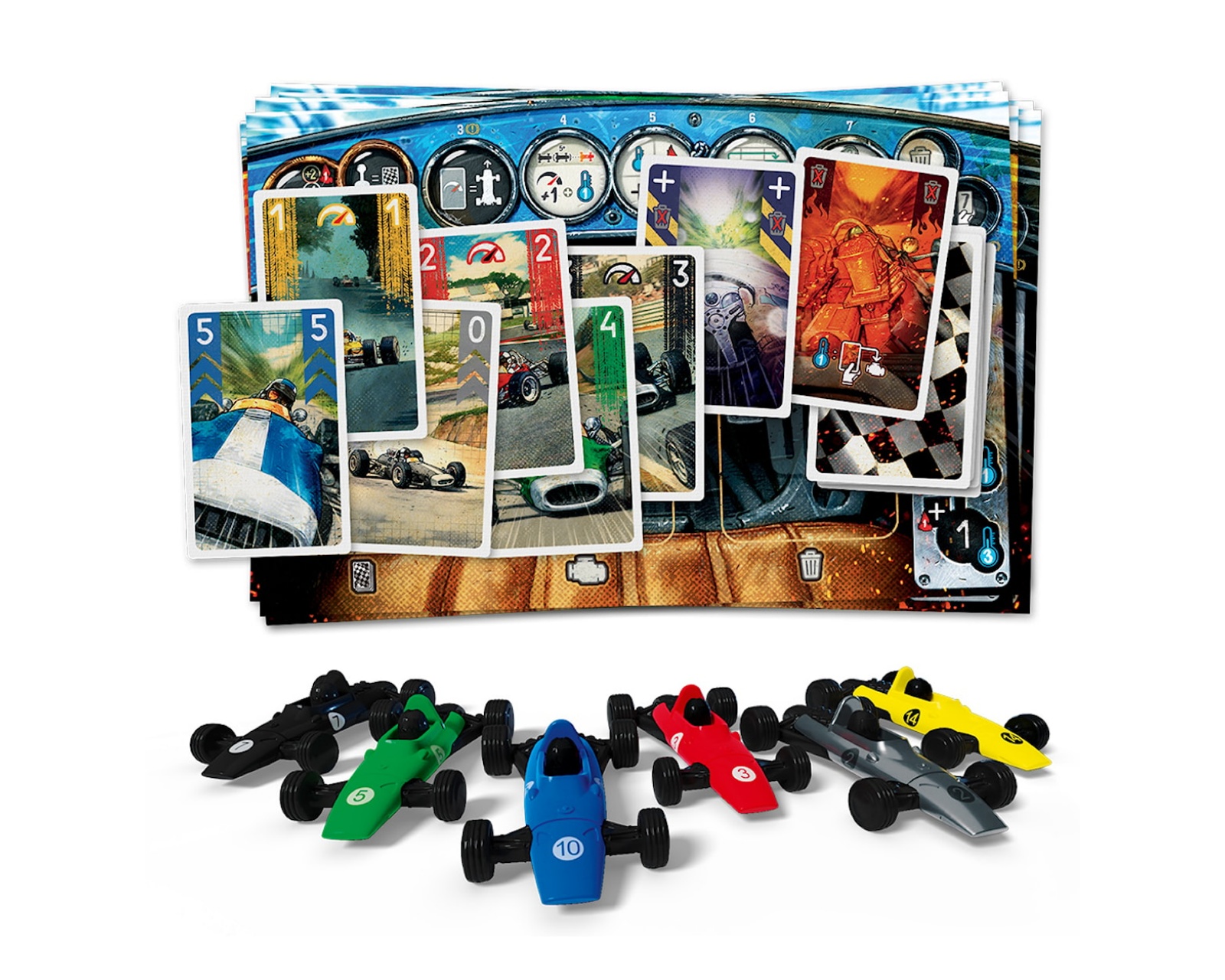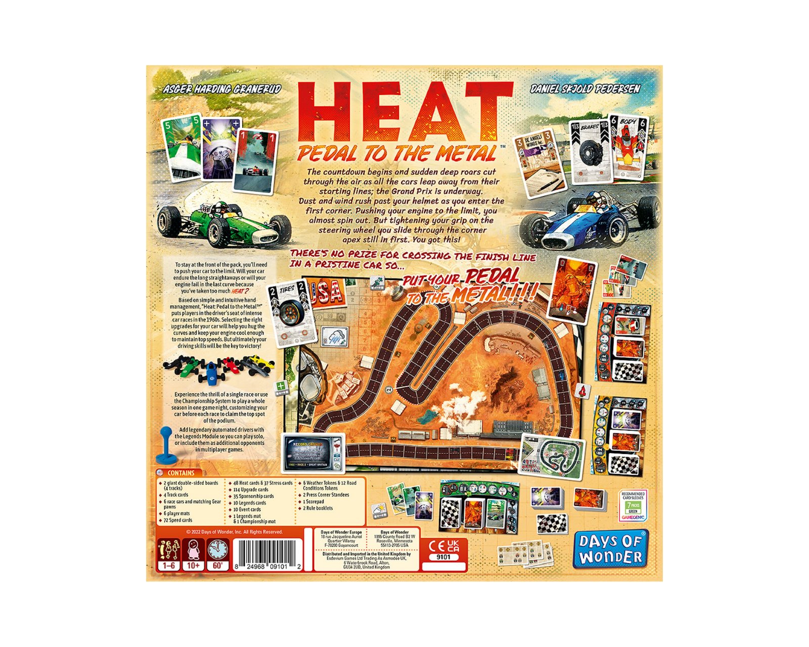 HEAT is a board game that offers a simple and intuitive use of cards, placing the gamer in the driver's seat during chaotic car races that took place in the 1960s. Players can choose between single races or championship rules to play through the entire season, and each race requires strategic upgrades to the car to handle curves and keep the engine cool, which is essential for reaching top speed. The game is designed for 1-6 players, allowing for a flexible gaming experience, whether playing solo or with others.The details of the game's components are carefully designed to create an authentic gaming experience. The car cards represent different vehicles from the 1960s and come with specific attributes that affect the game's dynamics. By implementing legendary automated drivers through the legend module, the gamer gets the opportunity to expand their game strategy and competitiveness, leading to endless possibilities to adjust tactics.