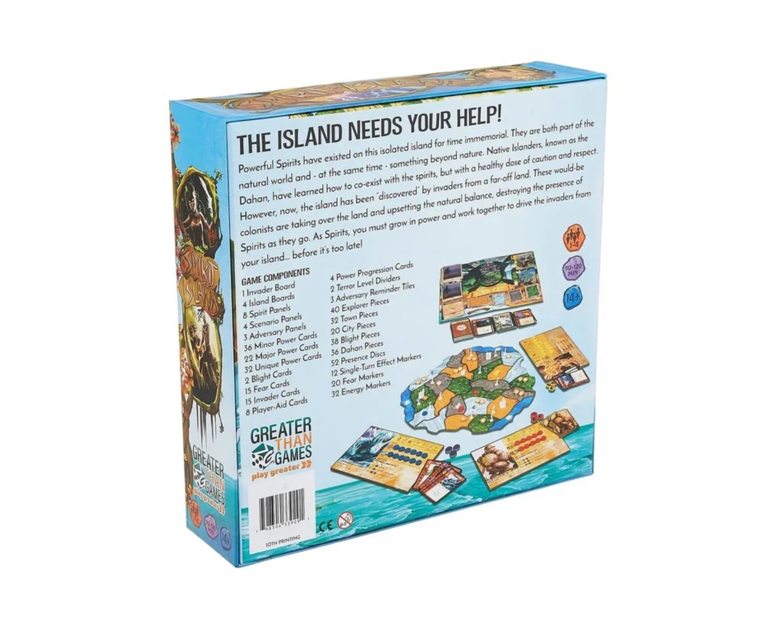 Spirit Island is a cooperative board game about defending your island from colonizing invaders. The game offers each player the opportunity to control different spirits of the land, each with unique elemental powers. Players simultaneously choose which power cards to play each turn, which cost energy. By combining power cards that match a spirit's elemental affinities, players can gain bonus abilities. Fast powers are resolved immediately before the invaders can spread, while other spells require more planning. During the spirit phase, the spirits gain energy and choose how they grow, either by reclaiming used power cards, seeking new power, or spreading their presence to new areas on the island. The invaders expand across the board in a partially predictable pattern. Each turn they explore different parts of the island, building settlements and cities, and causing blight when they attack native inhabitants. The spirits fight back against the invaders and protect the island. The complexity of the game increases over time and offers different difficulty levels, with a variety of opponents to combat. Summary- Cooperative board game