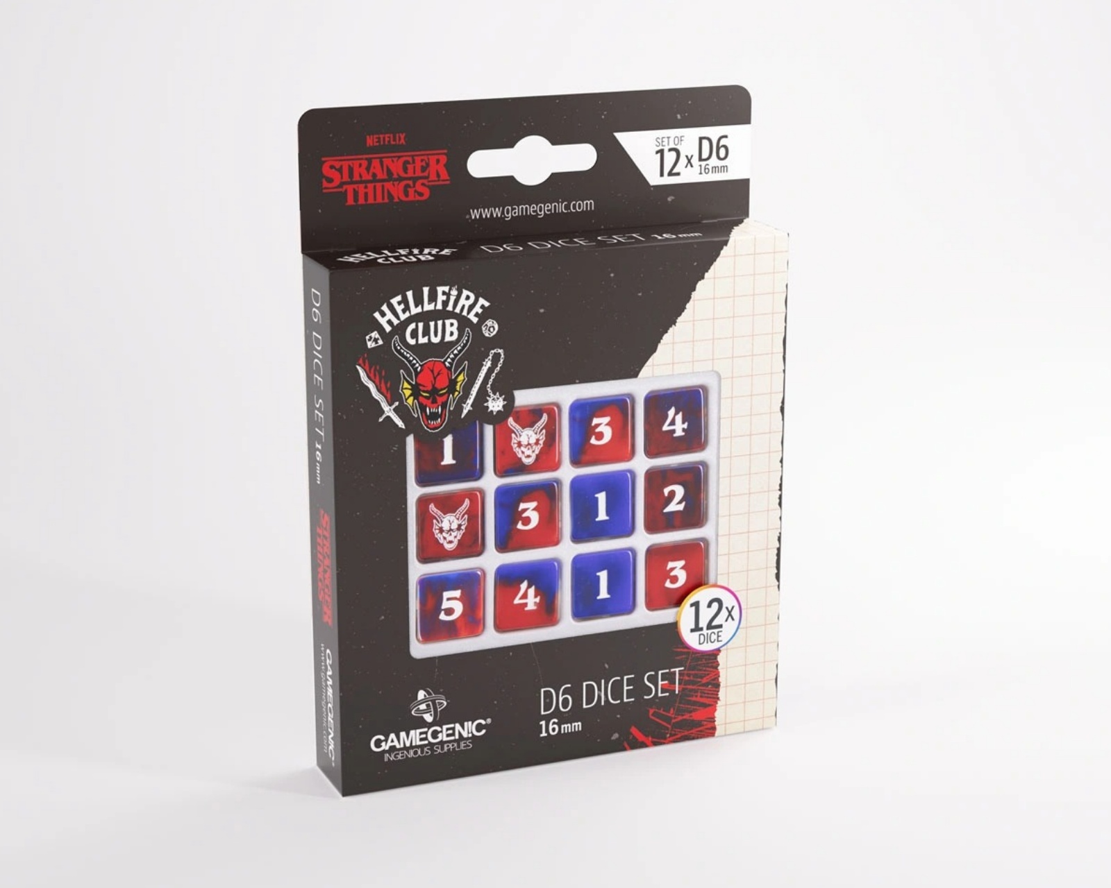 Hellfire Club D6 dice set 16mm is a set of 12 high-quality dice from Stranger Things™. These six-sided dice are made of resin and are a component intended for RPG, board games, and tabletop games. The dice have a size of 16 mm and are characterized by smooth, rounded edges that provide a pleasant feel when rolled, as well as clear visibility of the numbers. The manufacturing material, resin, contributes to a robust and durable build quality.The design includes a unique feature where "Number 6" is represented by the Hellfire Club logo, giving the dice a theme from the series. The dice have an attractive visual style through a combination of two colors, which distinguishes them from regular dice sets. The planned packaging type is a window box made of cardboard, making it easy to display the contents.