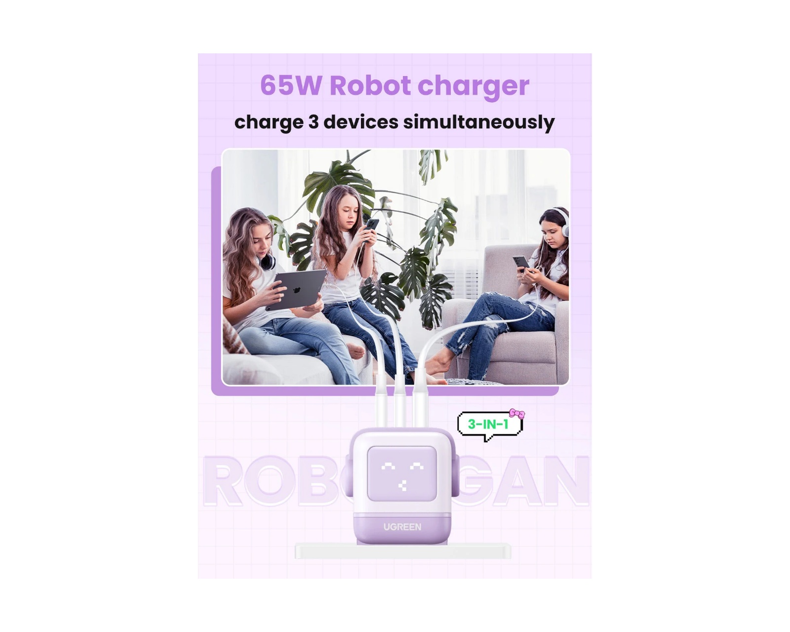 The Nexode Robot Charger with 3 ports and 65W is a practical and efficient charging solution for your electronic devices. Multiple ports allow you to charge multiple devices simultaneously, saving time and providing convenience. Its 65W output makes it possible to quickly and efficiently charge your devices so that you are always ready to go.Nexode Robot chargers are not only practical but also stylish, making them a perfect combination of modern technology and user-friendly functions. This unique design makes charging simple, smooth and efficient for an enhanced user experience.