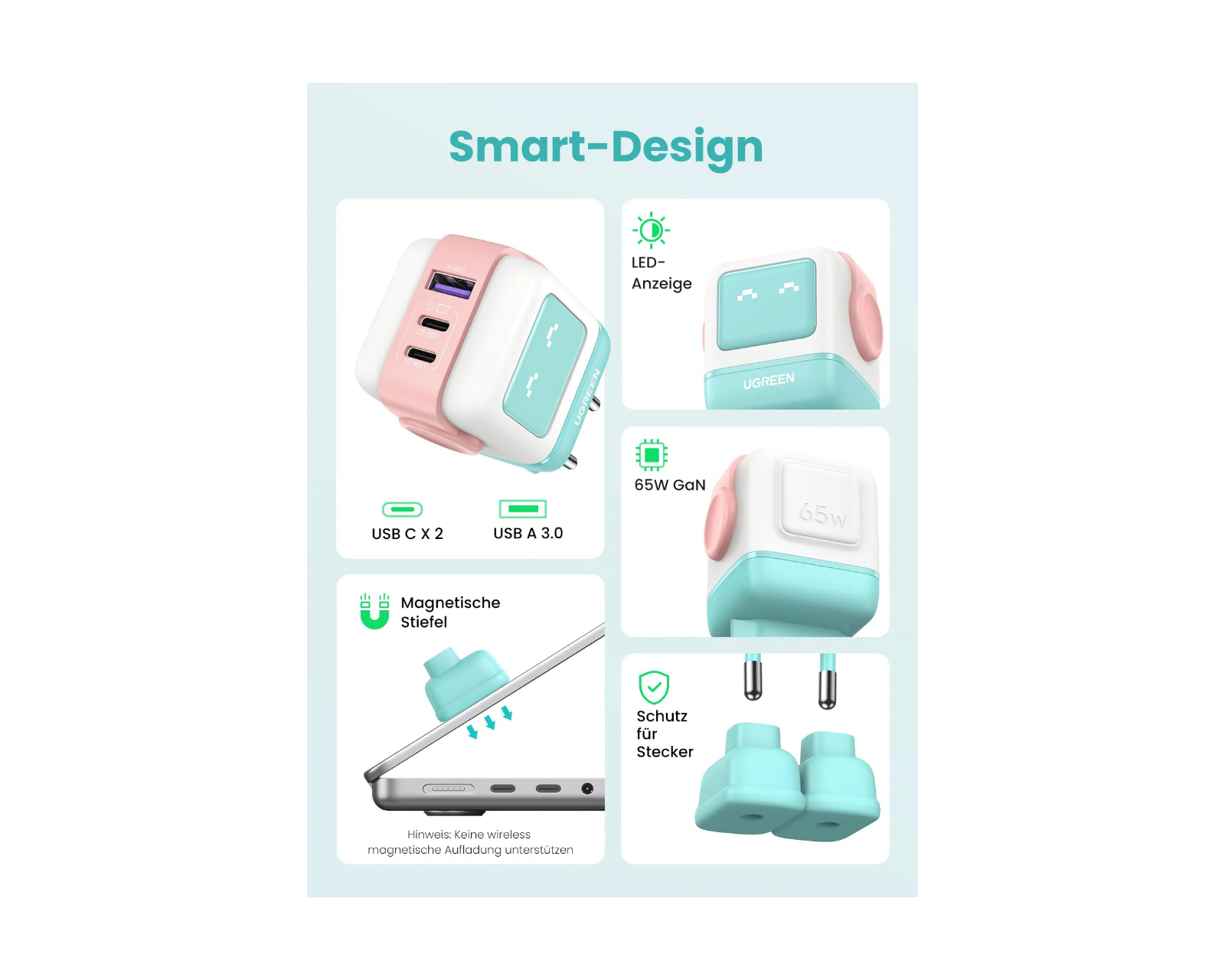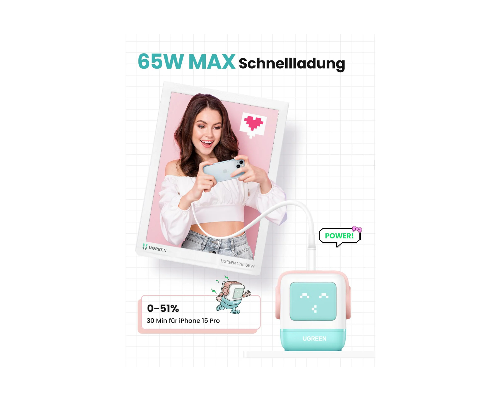 Uno Robot GaN is a powerful and compact fast charger equipped with three charging ports, perfect for charging multiple devices at the same time. It has two USB-C ports, where one offers a maximum output of up to 65W, ideal for charging laptops, tablets, and other power-demanding devices, while the other has a maximum output of 30W, perfect for smartphones and smaller devices.
