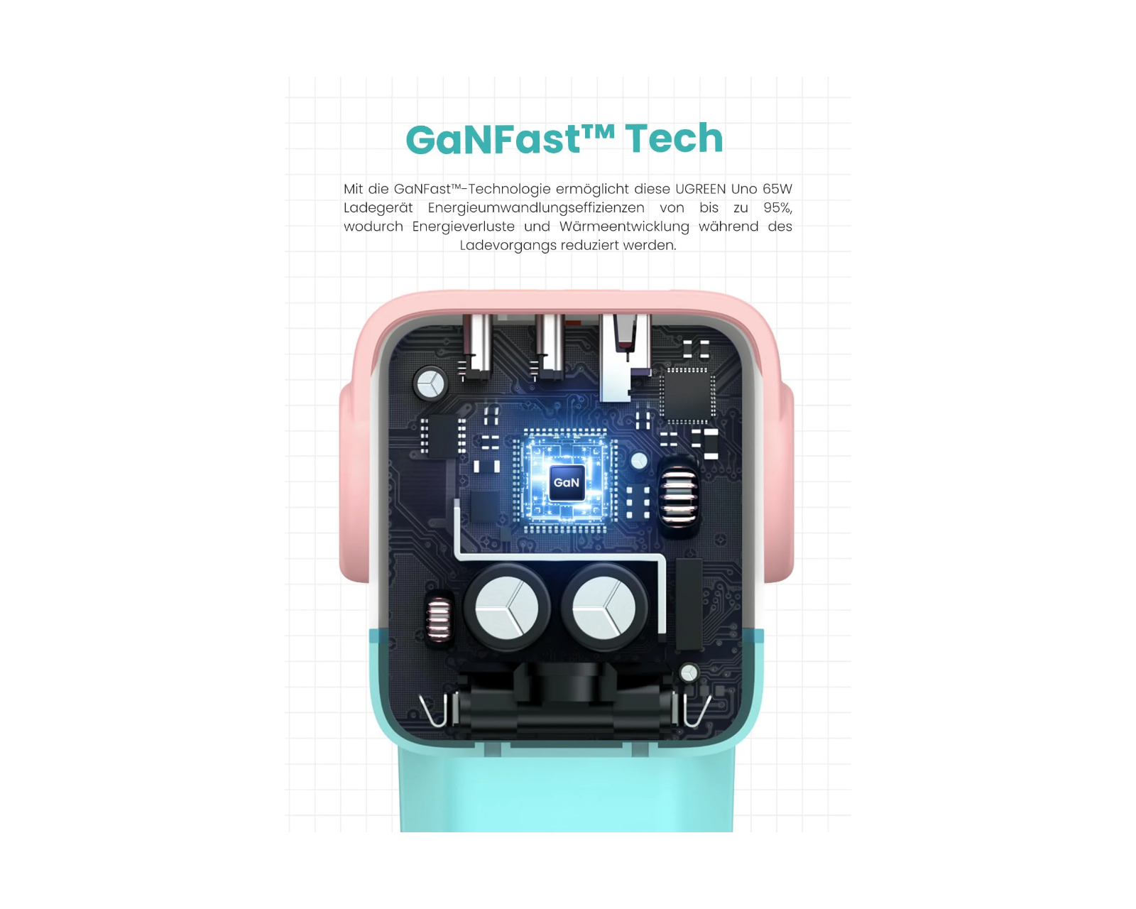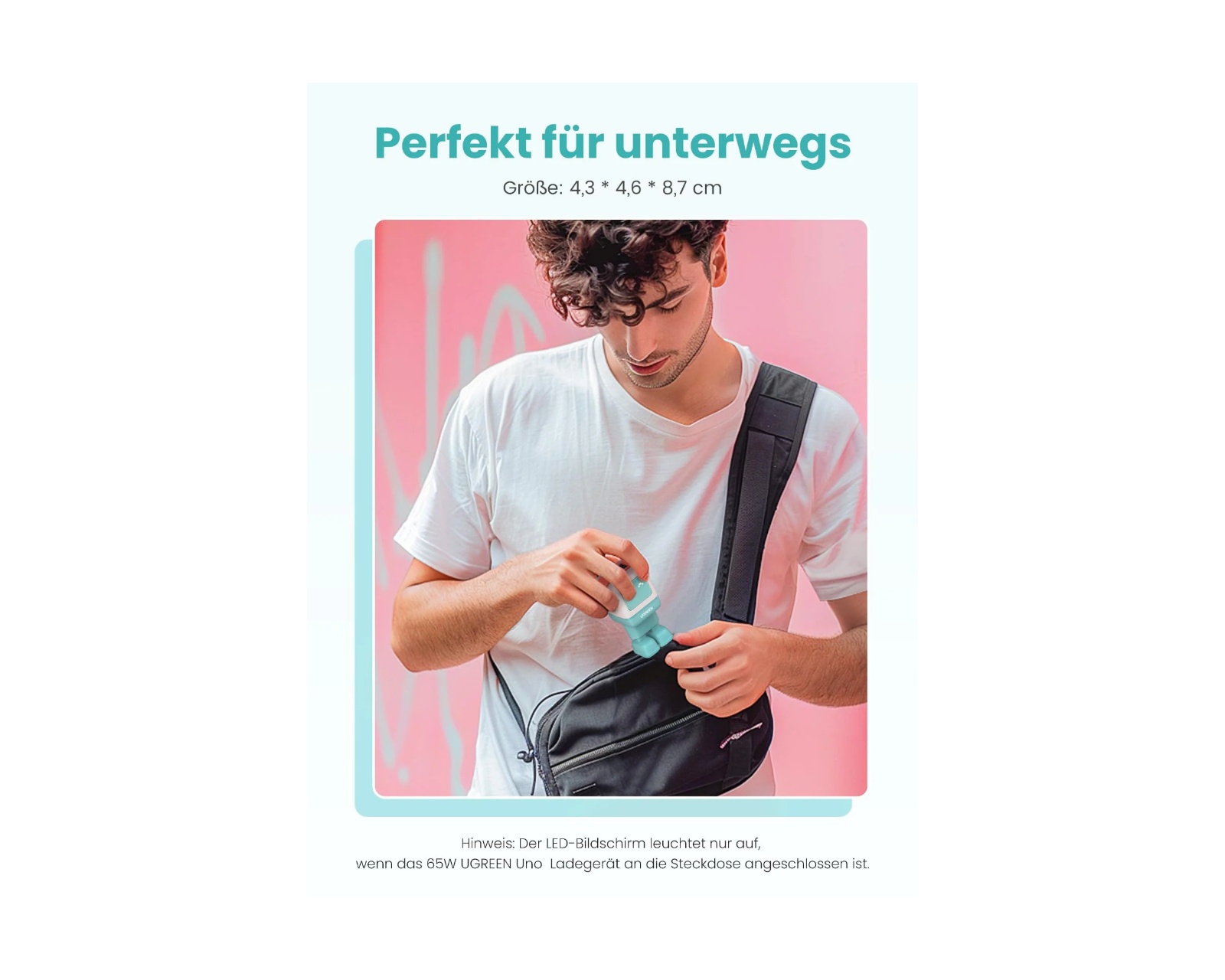 In addition, there is a USB-A port with a maximum power of 22.5W, which makes it easy to charge older or less power-demanding devices. The total maximum output power is 65W, which ensures fast and efficient charging for all your devices.