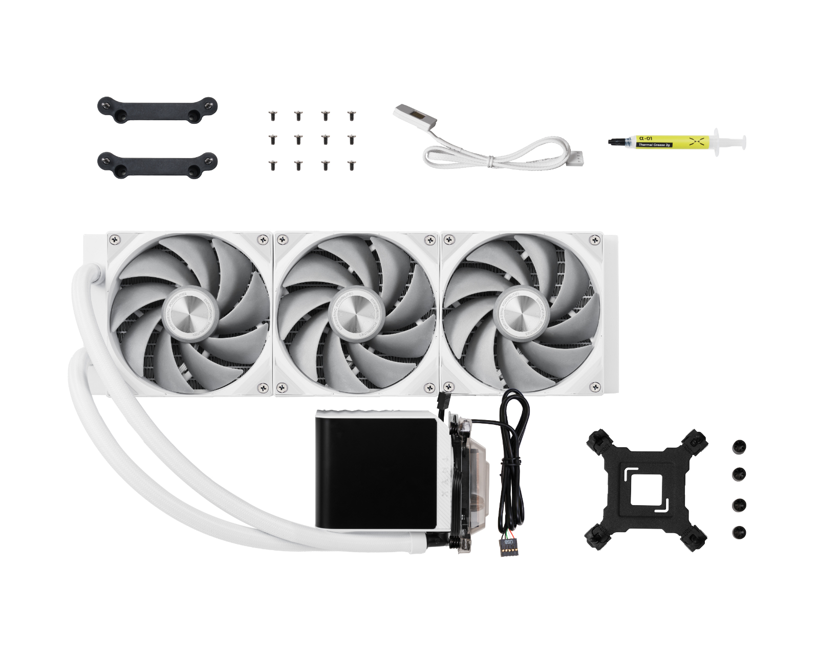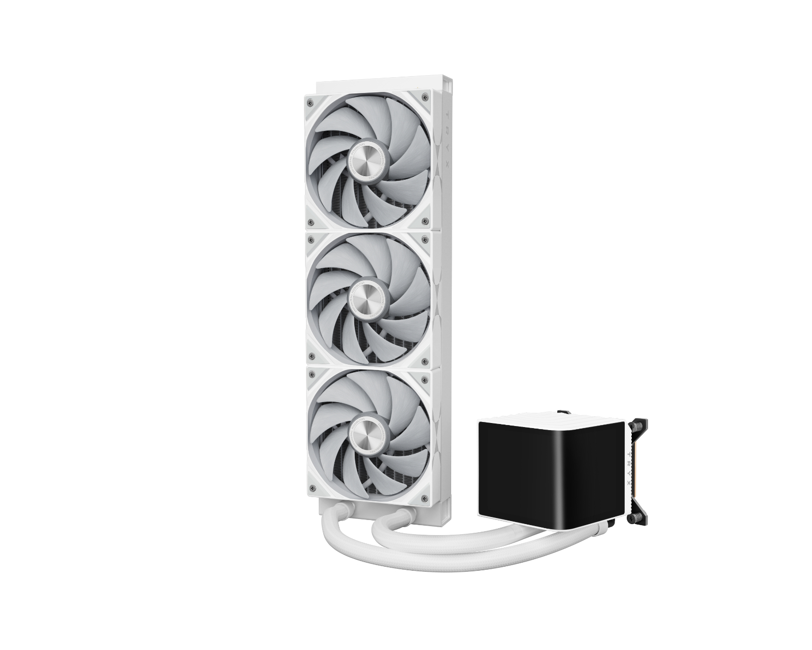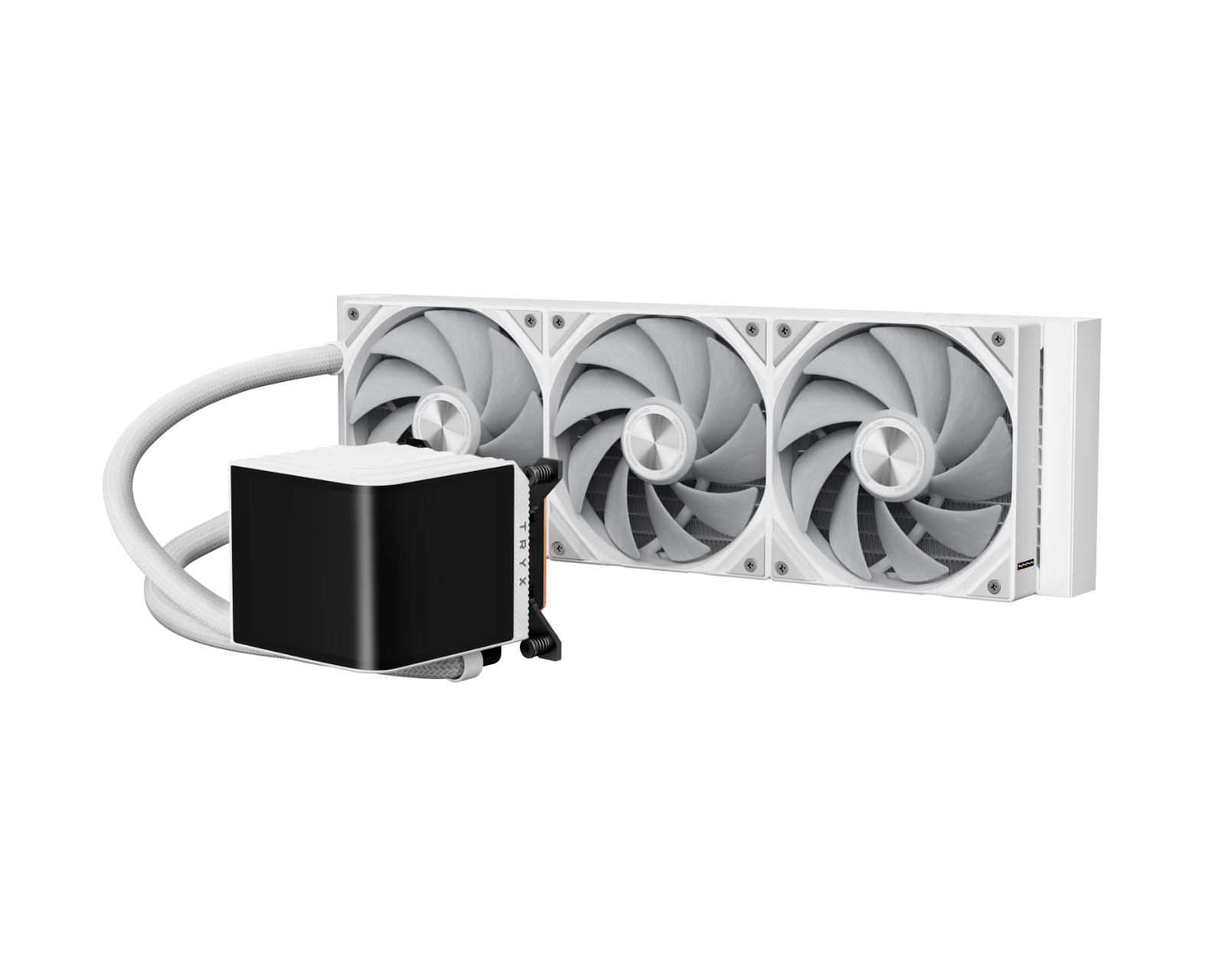 Panorama 360 is a 360 mm liquid cooler from TRYX that offers impressive cooling performance and sleek design. It features a 6.5-inch AMOLED display with 2K resolution, 372 PPI, and 500 nits brightness. The innovative L-shaped design ensures optimal visibility from different angles, making it ideal for gaming and multitasking.The latest Asetek 8th generation V2 pump with 3-phase motor and 320 W TDP enables up to 3600 RPM, ensuring efficient cooling capacity. The radiator is 30 mm thick with high-density fins and 40% thicker hoses, maximizing heat dissipation. It is compatible with Intel Core Ultra CPUs, and installation is facilitated by an adjustable mounting bracket. The TRYX Panorama 360 in white is also equipped with three ROTA SL PRO fans, generating 138.24 m³/h airflow.