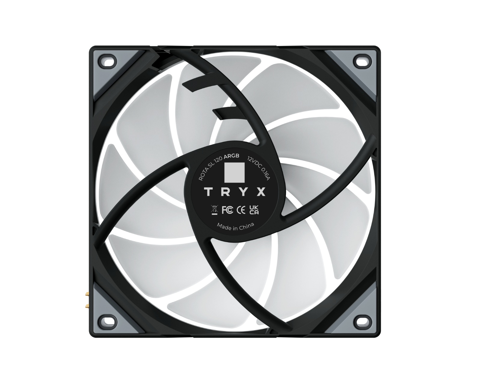 ROTA SL ARGB 120mm is a chassis fan from TRYX that offers efficient airflow and customizable lighting. The fan features built-in Gen2 ARGB lighting that can be tailored to create visual light shows in a PC case. With standard dimensions of 120x120x25 mm and a maximum rotation speed of 1850 RPM, it is suitable for various types of computer builds. The noise level is kept under 28.87 dB(A) even at full load, making it suitable for a quiet operating environment.ROTA SL ARGB 120mm is made of copper, metal, and polybutylene terephthalate, which contributes to stable build quality and long durability. The fan utilizes a magnetic contactless solution with pogo pins for easier cable management and daisy chaining. To minimize vibration, the fan is equipped with four noise-dampening pads. With a static pressure of 2.49 mmAq and an airflow of 65.64 CFM, this fan ensures effective cooling of various components in most standard cases.