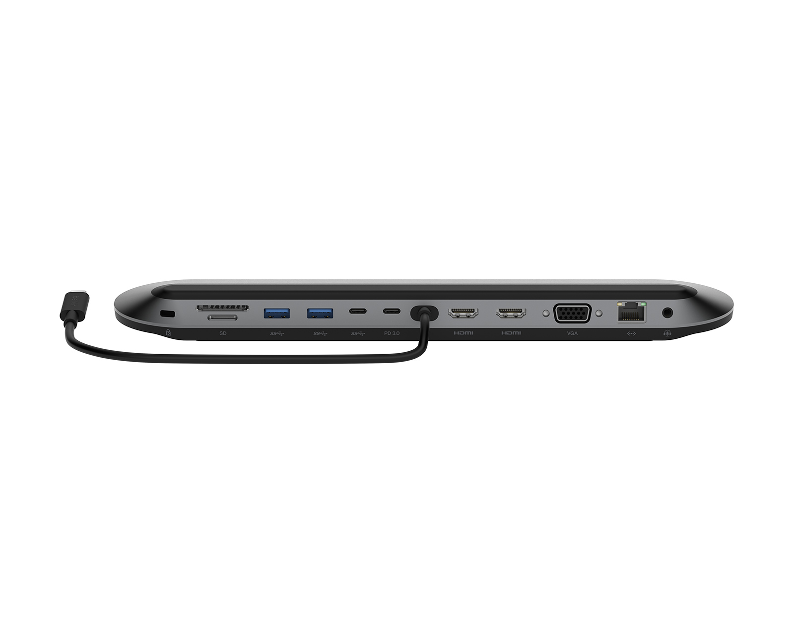 It offers 1 USB-C PD for fast charging, 1 USB-C for data transfer, 2 USB-A for connecting various accessories. 2 HDMI ports (one HDMI 2.0 for high-definition video and one HDMI 1.4 for standard definition). 1 Gigabit Ethernet port for a stable internet connection and 1 VGA port for older monitors. 1 SD card slot and 1 Micro-SD card slot for memory cards, as well as a 3.5mm audio port for headphones or speakers.