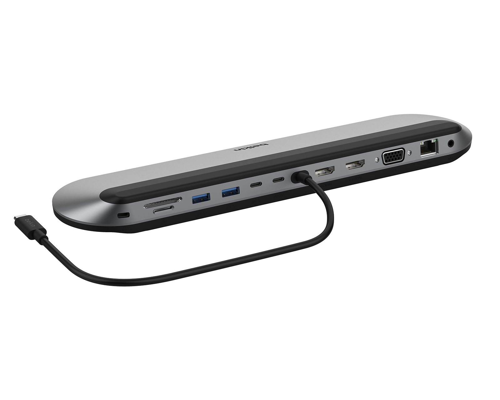 The 11-in-1 Universal Pro Docking Station is the perfect solution for efficiently connecting all your devices. With 11 different ports, you can easily connect everything from monitors and keyboards to external hard drives and network cables. Its compact design and high performance make it ideal for both work and entertainment, whether you're at home or in the office.