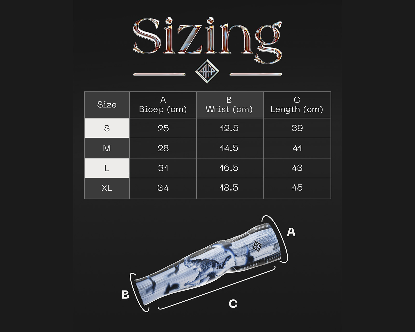 XL: Wrist: 18.5CM, Bicep: 34CM, Length 45CM