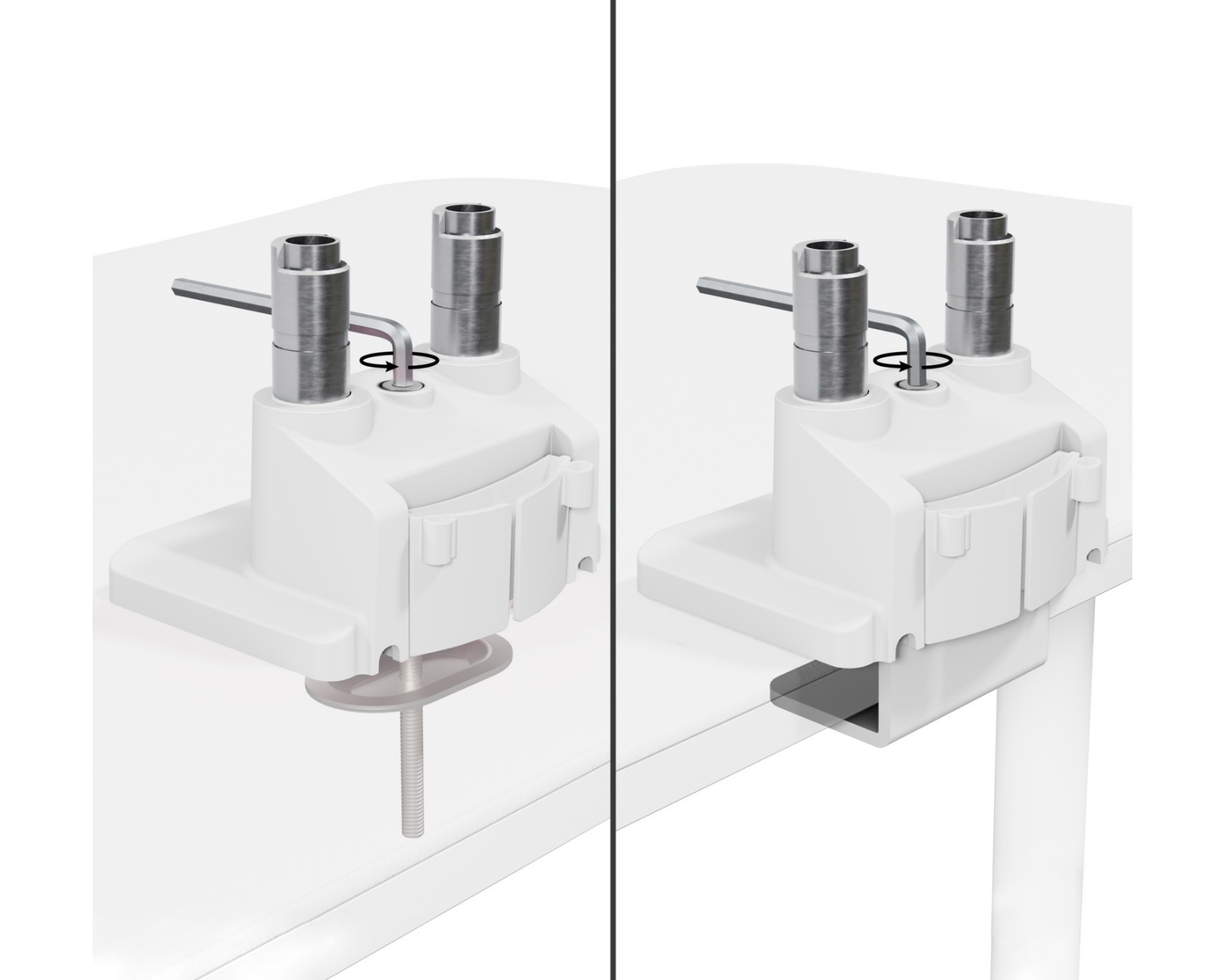 The monitor stand is made of steel and offers high durability and stability. With tilt options between +45° to -45° and a swivel range of +90° to -90°, the angle of each monitor can be adjusted to achieve an ergonomically correct position. Rotation occurs at 360 degrees, providing great flexibility during use. Installation takes place with a clamp, which simplifies the installation on the desk. The stand also features built-in cable management to keep the workspace tidy and free from cables.
