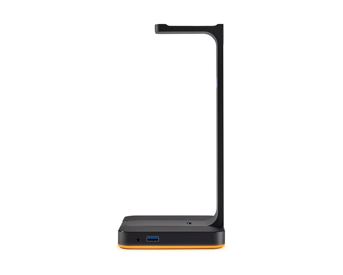 DEMO: Return and test sample. Good condition.You can proudly display your headset with its ST100 RGB Premium Headset Stand, featuring a premium aluminum construction and customizable RGB lighting. The built-in 3.5 mm analog input allows for a complete range of stereo or 7.1 surround sound for an immersive, multichannel audio experience. CUE software controls the RGB lighting and audio settings, and syncs with other CORSAIR RGB devices through an intuitive interface that is easy to use. Easily accessible dual USB 3.1 inputs enhance charging and provide faster data speeds for your headset, phone, and other devices, while the anti-slip rubber base provides stability and protection for your desk.