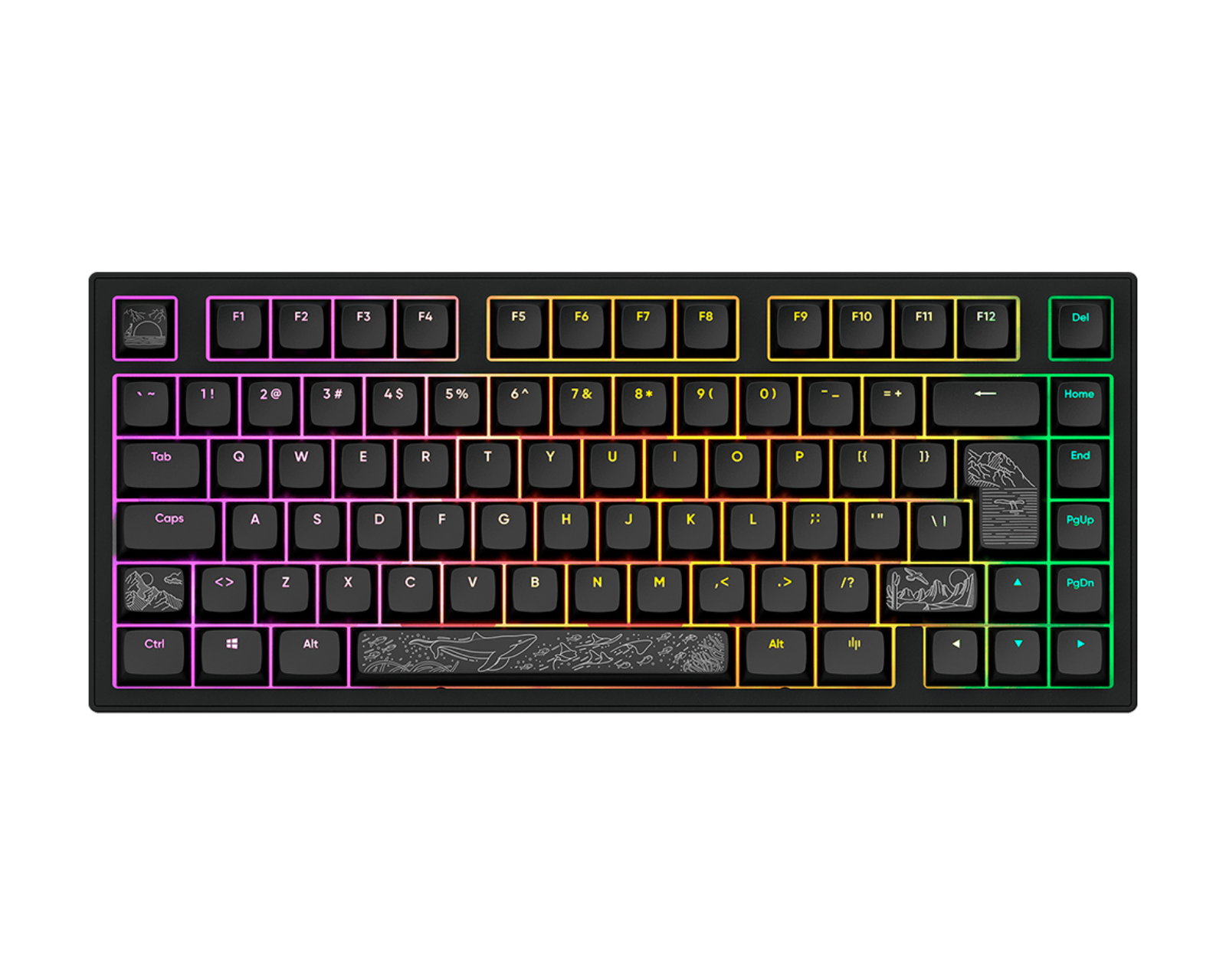 ALU81 features an aluminum construction with detailed engravings that reflect the beauty of nature. It is equipped with PBT keycaps that provide resistance to wear and chemicals. The keyboard offers hot-swap technology for quick and easy switch changes, allowing you to customize the keyboard without needing to disassemble it. It also has a double-layer sound dampening with Poron foam and silicone, minimizing noise levels during use. RGB backlighting can be easily customized through web-based software, compatible with various operating systems. The stabilizers are factory-mounted and lubricated to ensure a pleasant feel.