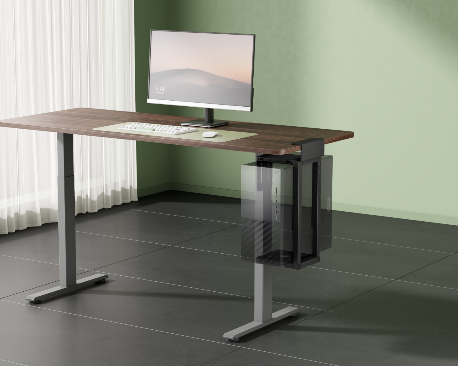 The construction of the computer holder includes a stable steel frame design and plastic components that together ensure it can support weights up to 30 kg. With a tool-free clamp base, the holder can be easily attached to the desk without damaging the surface. The adjustable structure allows for customization for different sizes of computer cases, while protective pads help prevent scratches and provide extra stability. Additionally, the computer holder is designed to handle larger CPUs with strong balance and support.