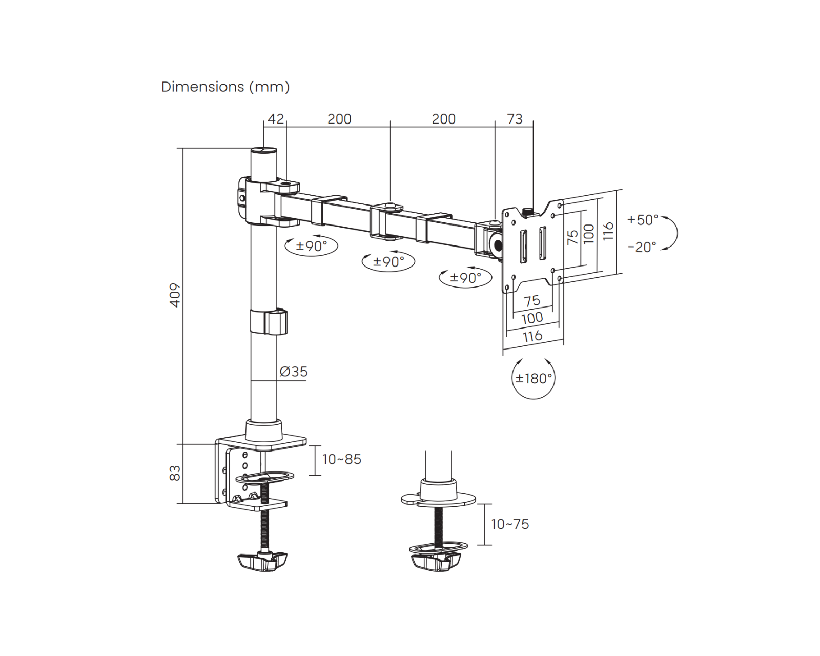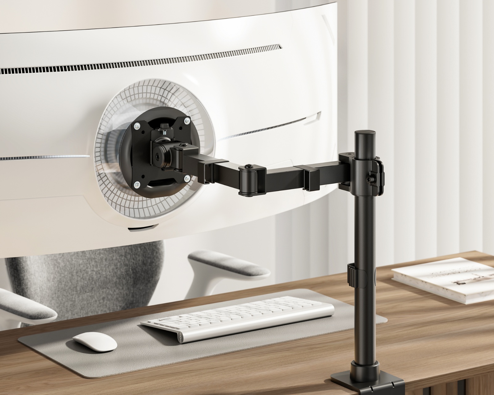 The monitor arm is made from sturdy materials that ensure long-lasting durability and reliability. The free height adjustment makes it easy to customize the position to optimize the working environment. The swivel feature provides multiple viewing angles, and the 360° rotatable VESA plate allows for further customization. The application of a free-tilt design enables the user to adjust the angle as needed.