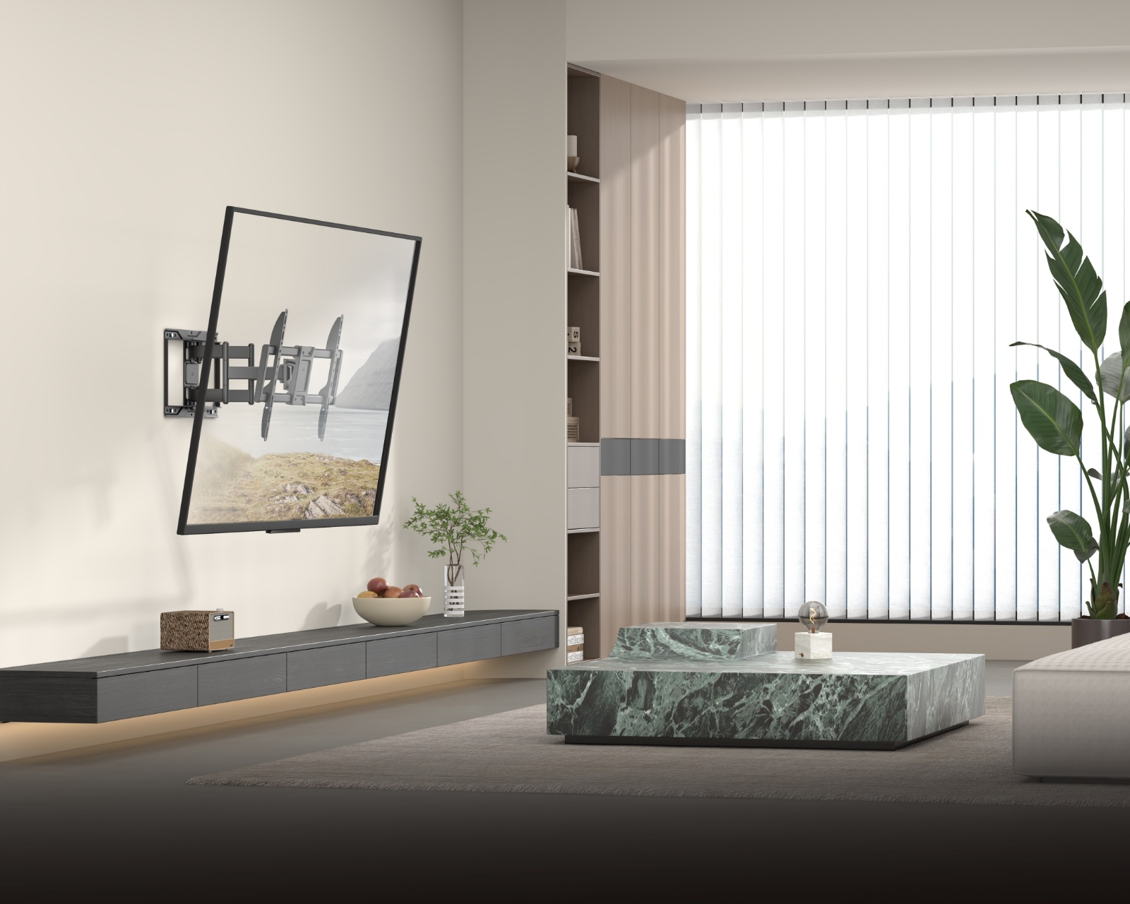 The wall mount is made of steel and plastic and has a maximum tilt of +60° to -60°, allowing the user to adjust the angle for the best possible image display. Its built-in cable management ensures a clean and organized installation, while the leveling adjustments allow for fine-tuning after installation. With a swivel design, you can easily adapt the TV to different viewing angles and optimize both functionality and comfort.