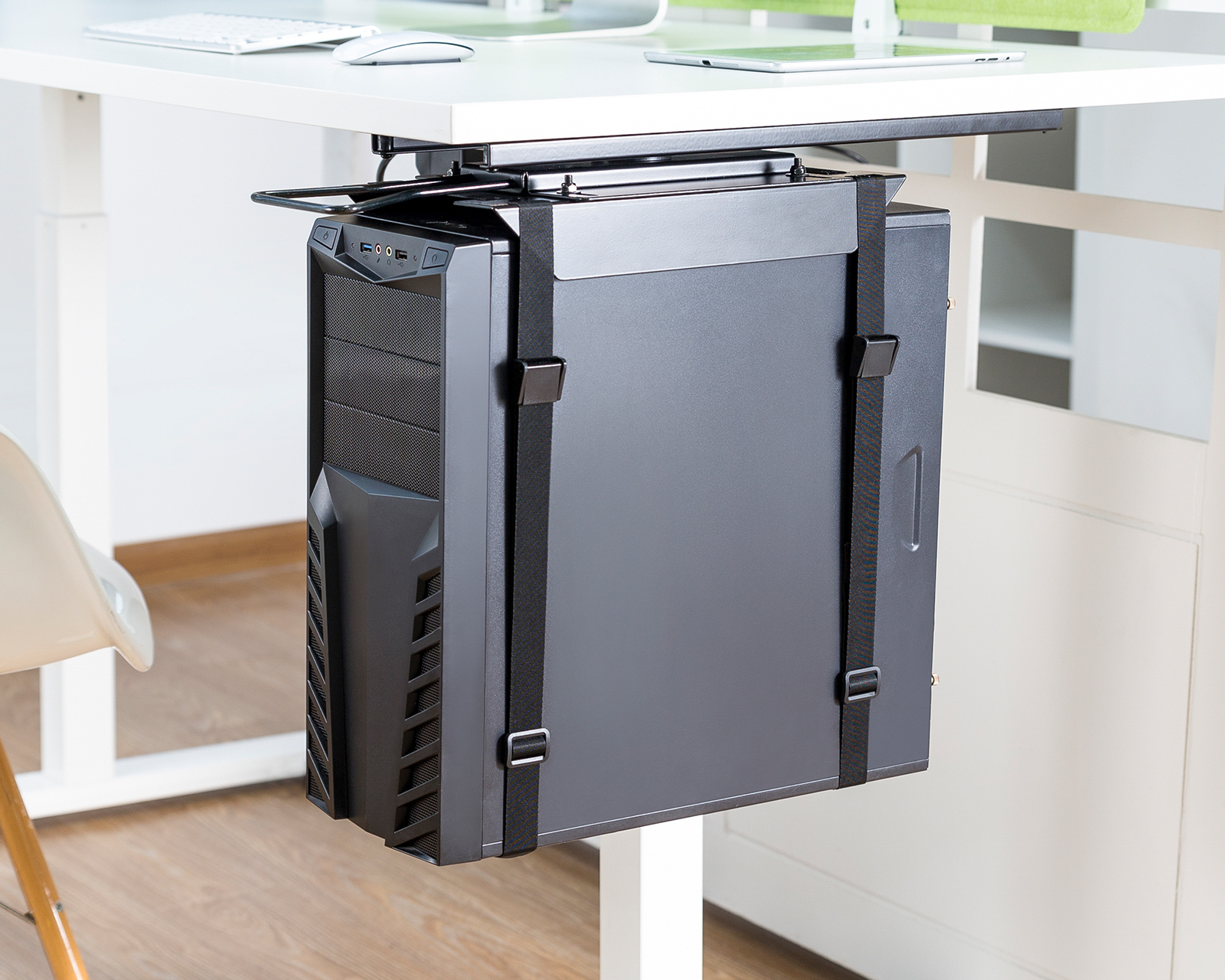 Introducing the MaxMount Strap-On Under-Desk CPU Holder - the ultimate solution to free up space and protect your valuable computer case. With its portable strap design, this CPU holder is easy to install and securely mounts your CPU under the desk.