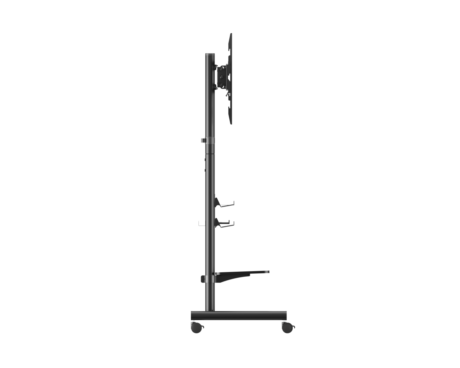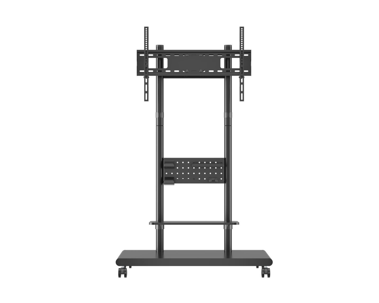 DEMO: Return and test item. Good condition.TV stand with shelves for 50"-90" is a TV mount on wheels from MaxMount designed to support televisions between 50 and 90 inches. This unit offers an integrated pegboard shelf for organizing remote controls, headphones, and power cables, as well as a wide, double-layer base for extra storage space. With adjustments for height, tilt, and swivel, users can customize the viewing angle.