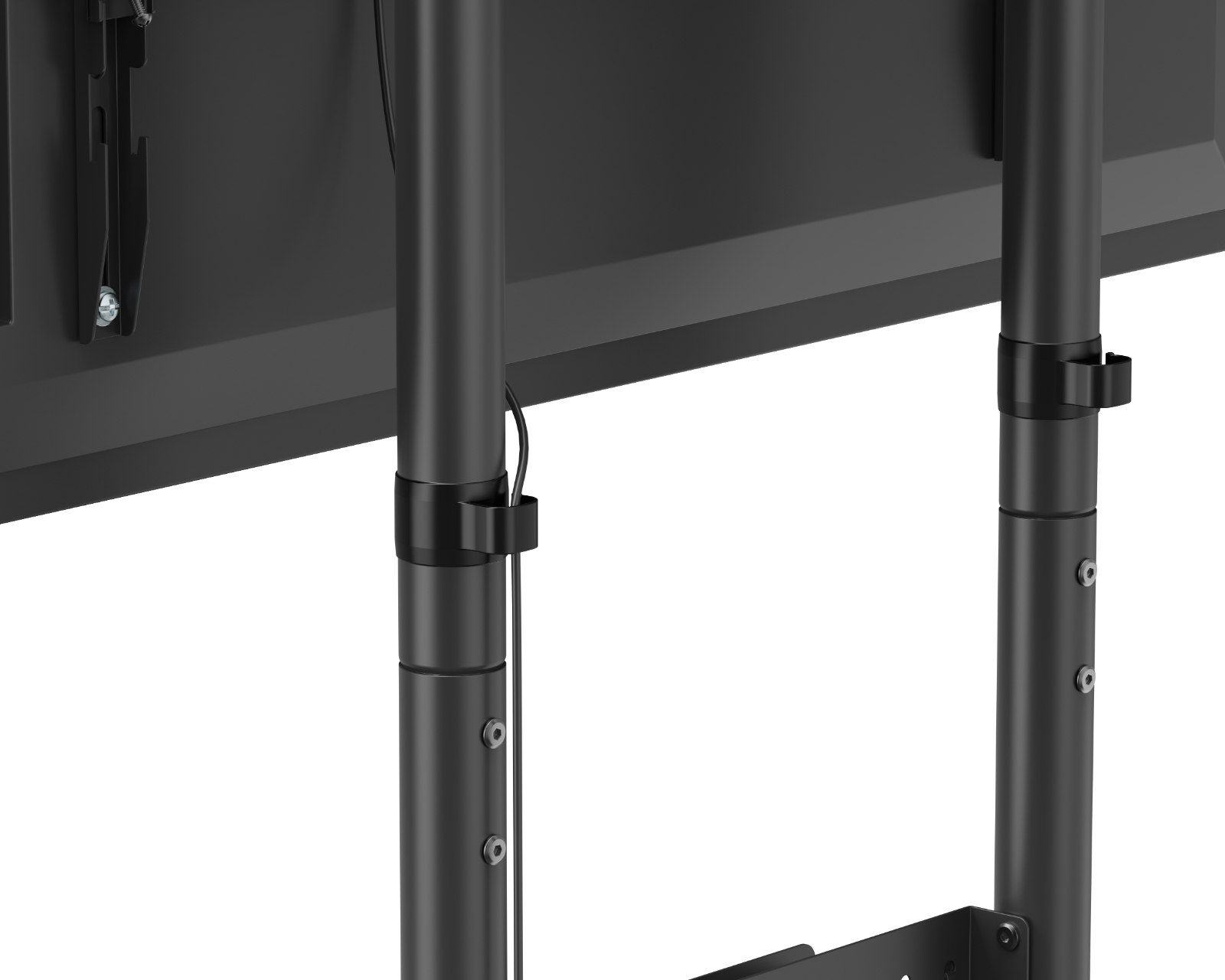 The unit is constructed with a focus on stability and durability, ensuring reliable performance during use. The pegboard shelf allows for tidy storage of cables and accessories, reducing clutter. Equipped with lockable wheels for easy maneuvering and secure placement of the TV. The height adjustment is flexible and customizable to optimize sightlines. An integrated cable management system ensures that all cables are managed in an orderly manner.