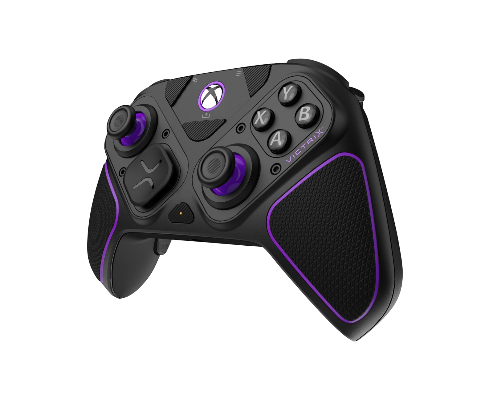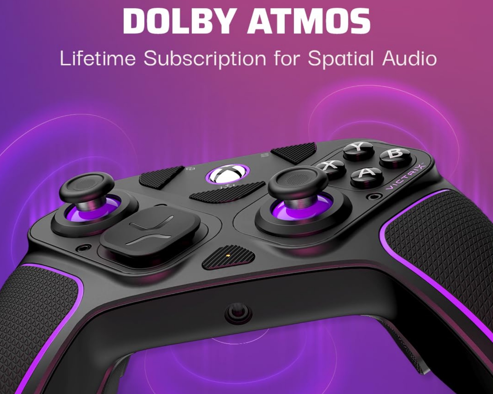 The modular design allows the user to configure the controller according to their own preferences with a reversible left module, a standard right module, a 6-button combat pad, and four interchangeable thumbsticks. The controller includes three different D-Pads and four different gates. Low-latency audio playback and built-in Dolby Atmos provide a spatial surround sound experience for gamers. Patented Clutch Triggers with five stop points and a hair-trigger mode, as well as four mappable back buttons, offer further customization options via the free Victrix Control Hub app.