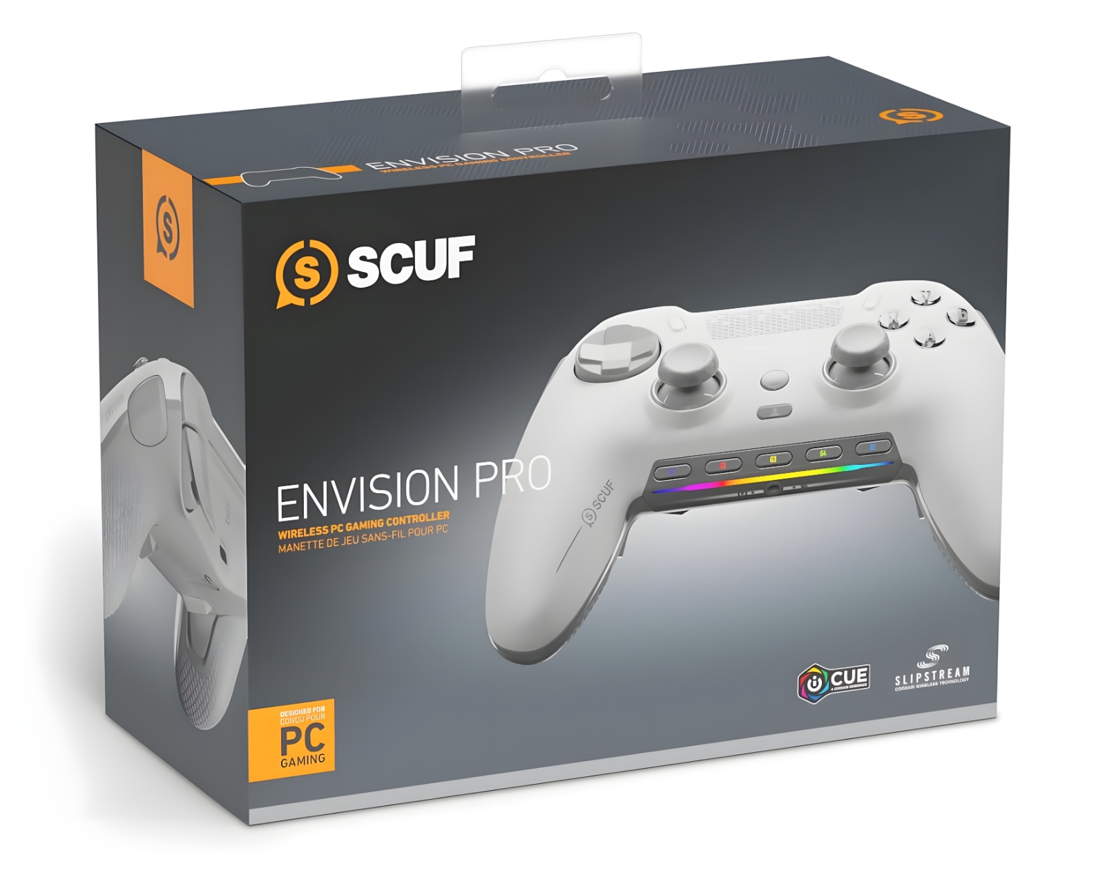 DEMO: Returns and test sample. Good condition.Envision Pro V1 is a wireless controller from Scuf, designed for PC use. The controller includes four rear paddles that can be reprogrammed, allowing for faster reactions without moving your thumbs from the sticks. It also features five fully reprogrammable G-keys for advanced macros and integration with Corsair iCUE. The device has two unique side-mounted SAX buttons for increased configurability, fitting the natural positioning of your fingers. OMRON mechanical buttons function as mouse clicks for instant activations. The controller utilizes Corsair SlipStream, providing an ultra-fast wireless connection.