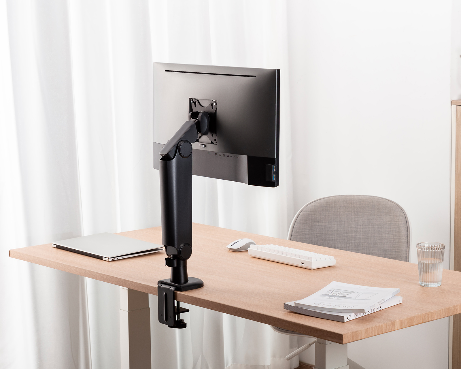 DEMO: Repurchase and test copies. Good condition.MaxMount Spring Assisted Single Monitor Arm - your solution for a comfortable and ergonomic work setup. The clampable monitor arm is designed to raise your monitor to the perfect height while giving your workplace a touch of elegant style.