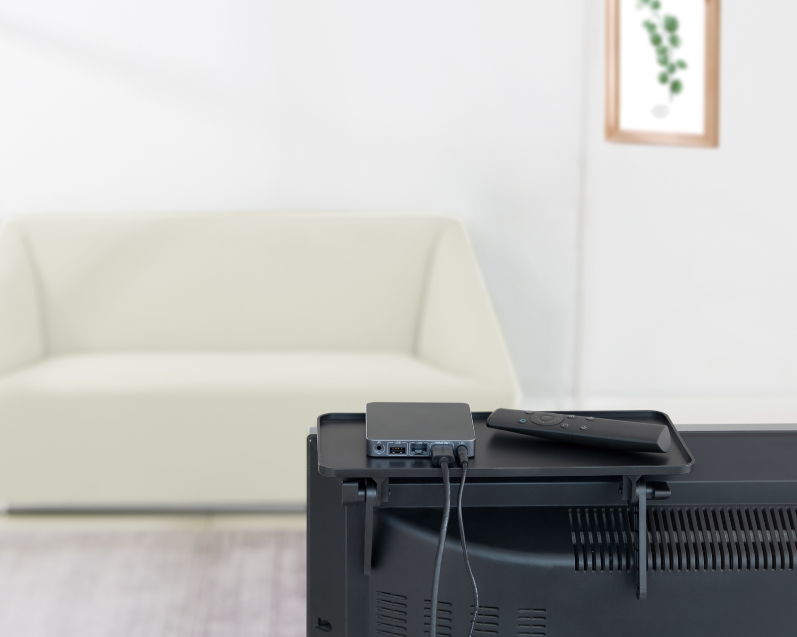 The top-mounted media shelf for TV from MaxMount is a solution for effectively placing media devices above television sets. The shelf is designed to be compatible with TV models that have a thickness of over 18 mm and offers a distance from the wall of more than 127 mm. The product has a load capacity of up to 6 kg and the dimensions of 300 mm x 127 mm provide ample space for remote controls and media boxes.The protective edges around the shelf prevent items from falling off, contributing to an organized and safe environment for your media-related devices. The easy-to-install design and practical locking button make it simple to mount the shelf, saving time and simplifying use. With a black finish, the shelf fits into most home and office environments, making it ideal for gamers and enthusiasts who value both function and aesthetics.