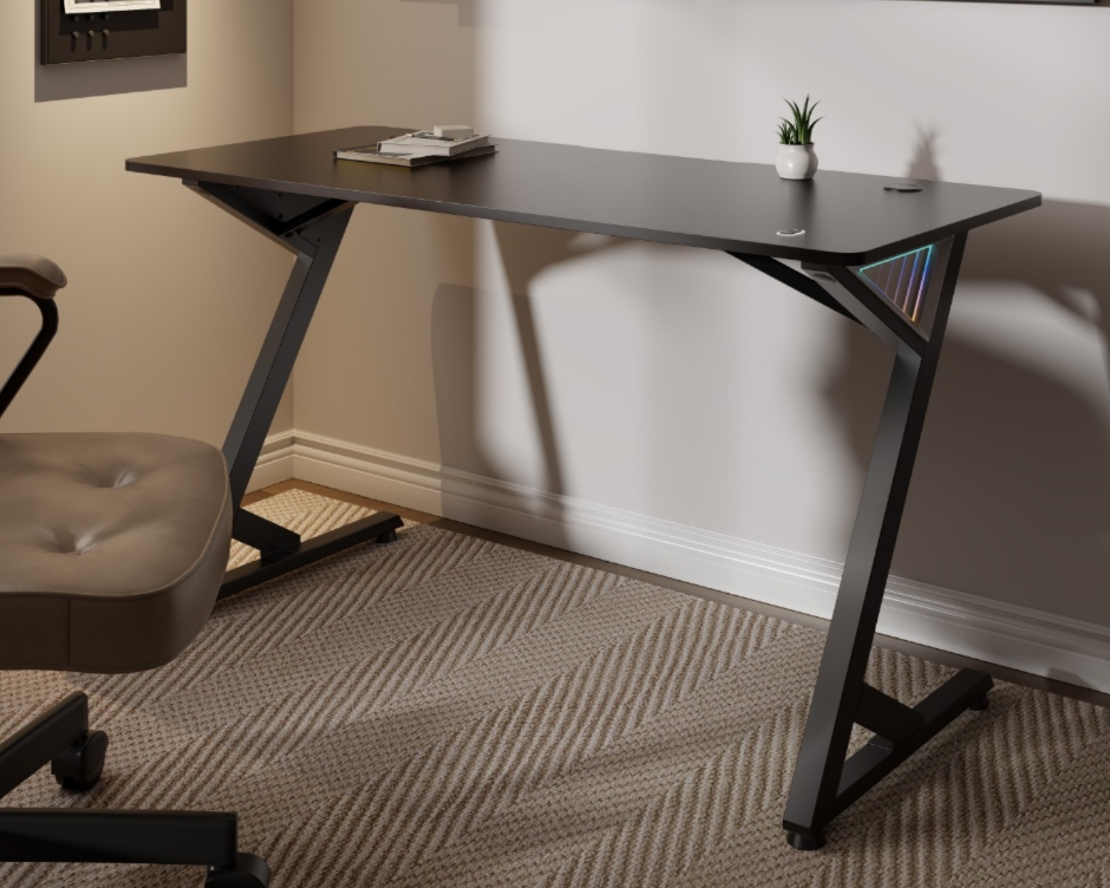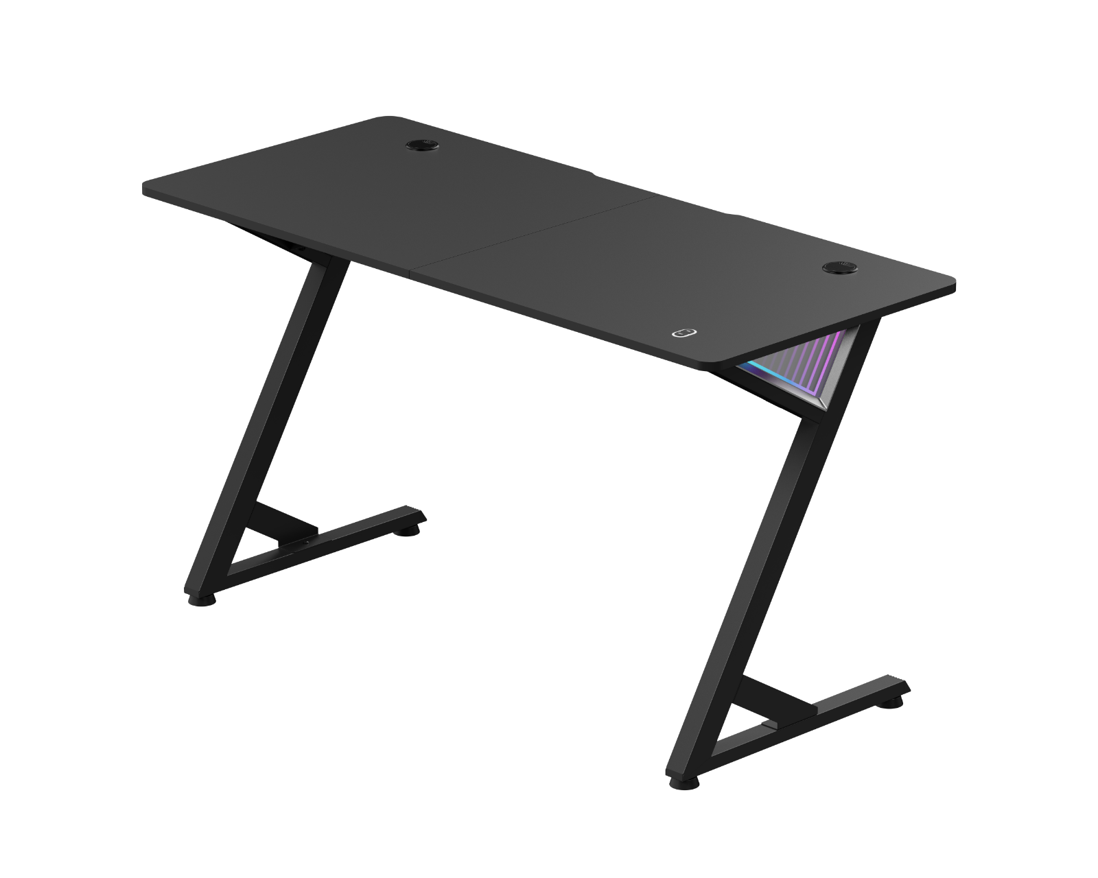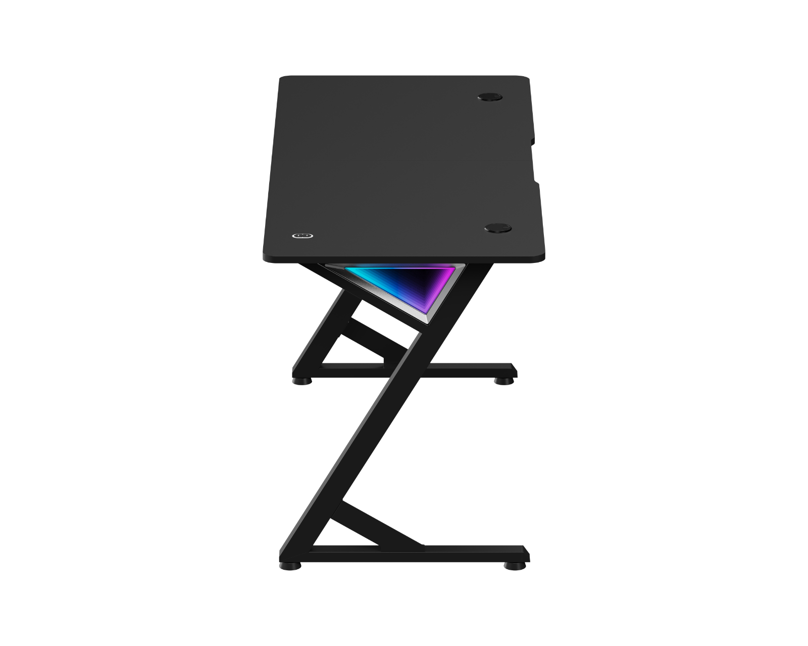 InfinityGlow Gaming Desk is a large desk surface from MaxMount. It features an integrated lighting effect with a built-in LED system in the structure of the legs, creating a dynamic atmosphere for the gaming environment. The desk surface measures 1360 x 600 mm and has a stable weight capacity of up to 75 kg. The desk is designed for gamers who want to create an impressive and functional gaming area.The desk has a futuristic design with Z-shaped legs, which creates a distinct aesthetic and ensures stability during use. The built-in cable management holes reduce clutter from cables and provide a clean look. The desk also has customizable decals to give a personal touch and enhance the mood. The minimalist look is complemented by lighting controls that are easy to reach.