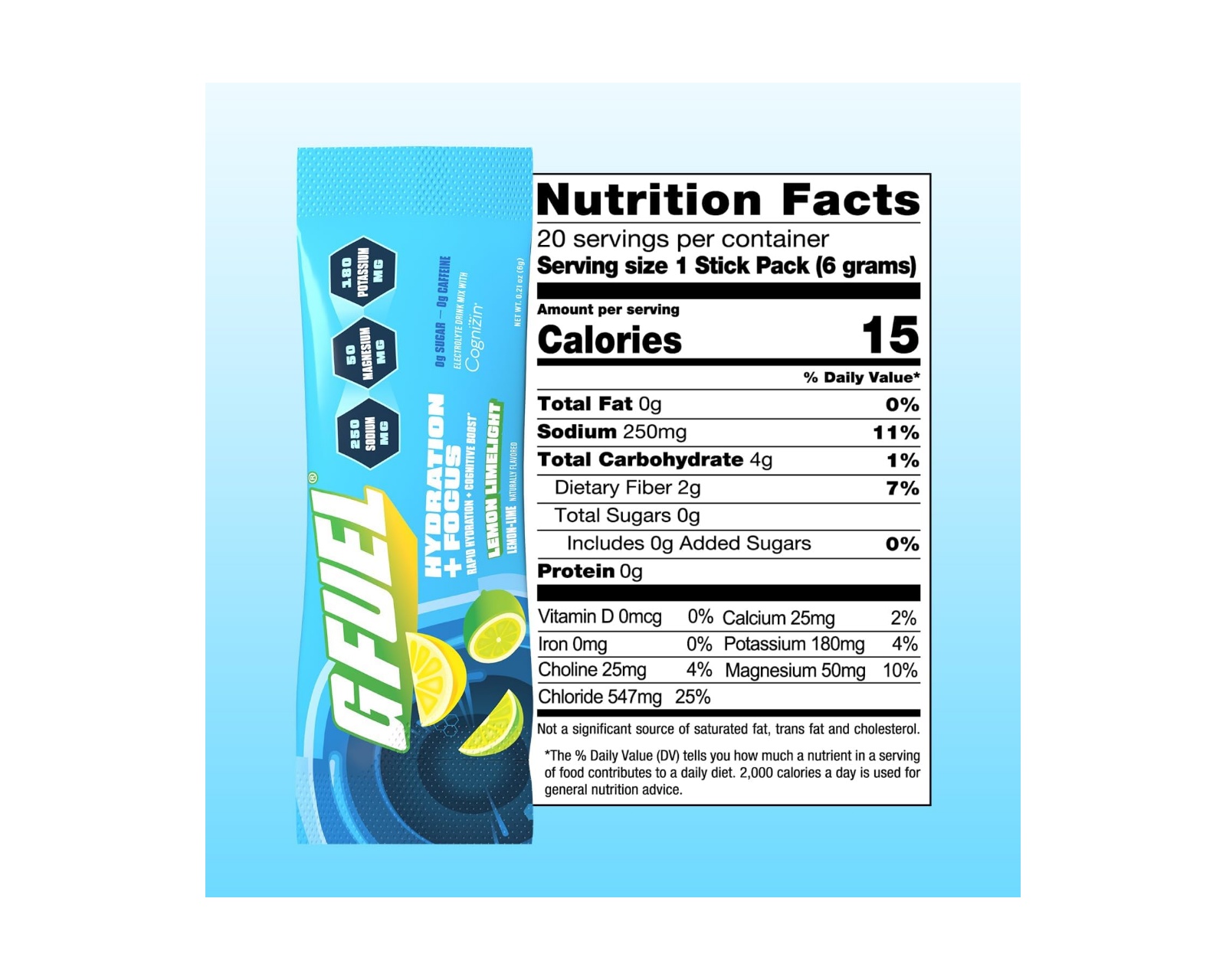 G Fuel Electrolytes Powder is an electrolyte powder from G Fuel that helps with immediate hydration and focus. The product contains a carefully crafted blend of 5 essential electrolytes, optimizing the body's fluid balance and supporting mental clarity. Each serving provides 250 mg of sodium, 50 mg of magnesium, and 180 mg of potassium, and is completely sugar-free with only 15 calories.It is suitable for gamers and active individuals seeking effective hydration. The powder is designed to provide quick hydration without a salty aftertaste, thanks to a delicious lemon-lime flavor. With its mix of electrolytes and nootropic ingredients like Cognizin, it promotes both memory and concentration. Due to its low calorie and sugar content, this is an ideal solution for those looking to stay hydrated without unnecessary additives.