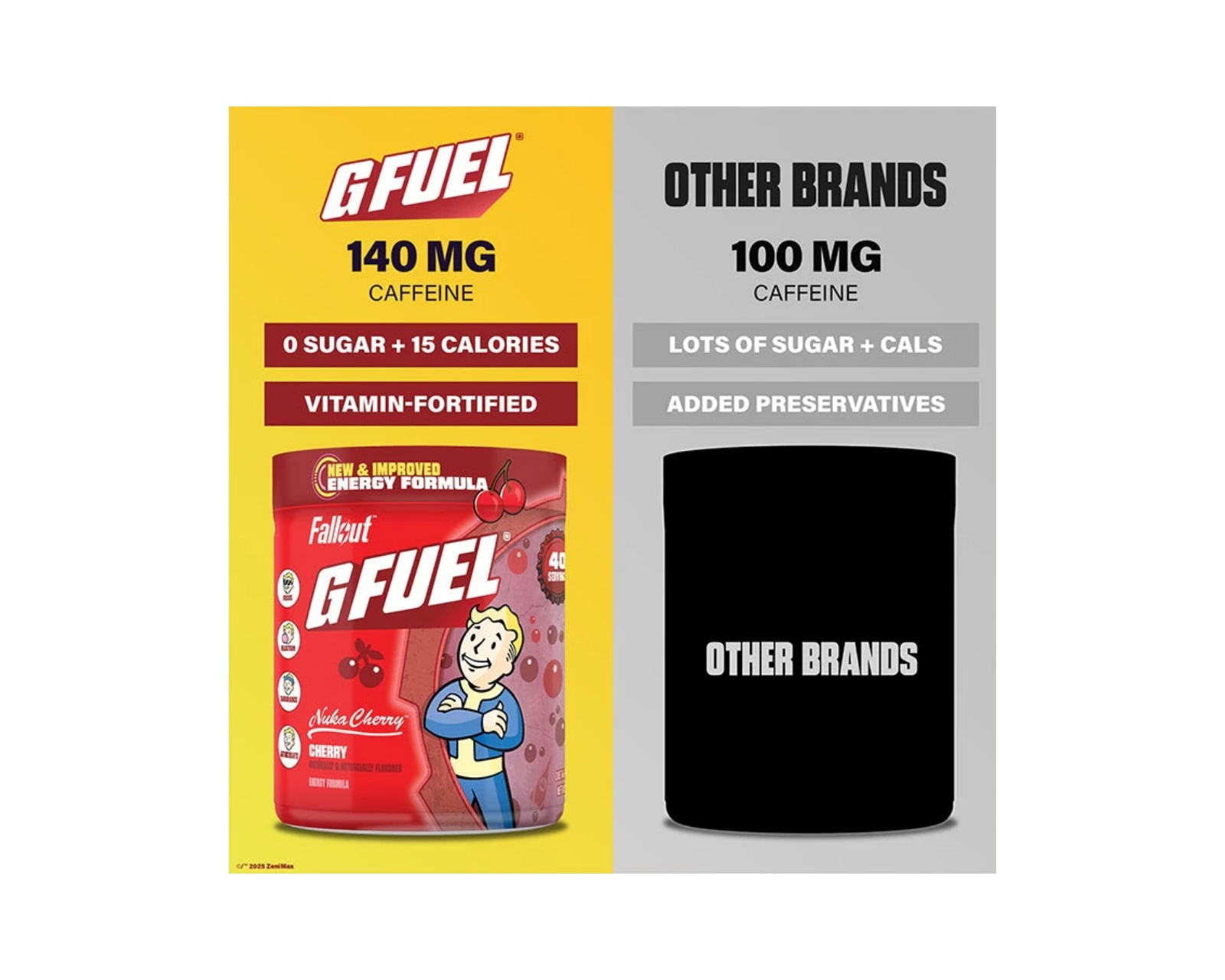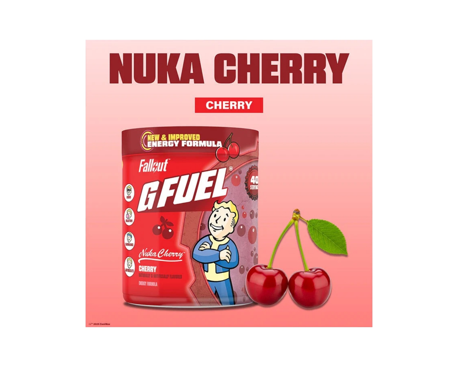 Nuka Cherry from G FUEL offers a unique cherry flavor. The product contains 40 servings with 140 mg of caffeine per serving. The drink is sugar-free and free from unnecessary fillers.An energy drink like Nuka Cherry is designed to maximize focus and endurance in gaming and other activities. With the improved formula 2.0, this drink includes antioxidants and ingredients that support both body and mind to tackle post-apocalyptic challenges.