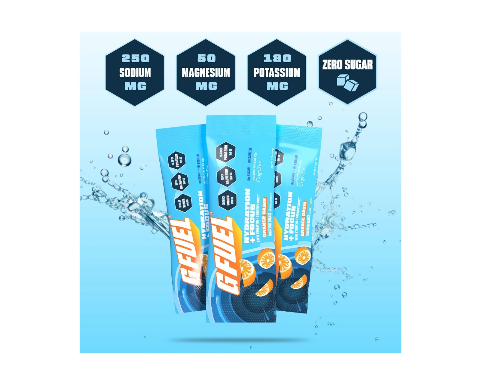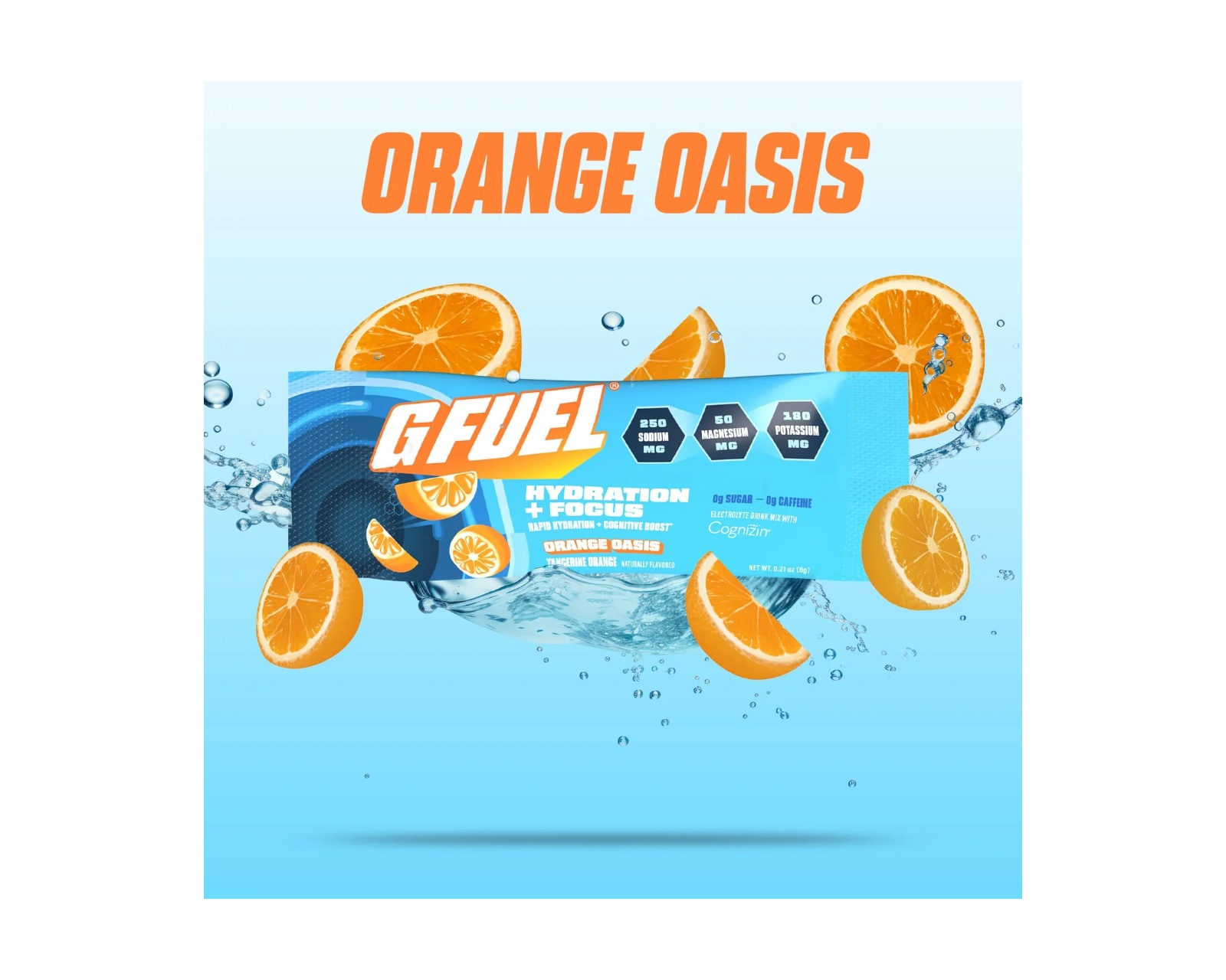 Orange Oasis Hydration + Focus Pack is an electrolyte powder product from G Fuel, designed for instant hydration and focus. With a unique blend of electrolytes and nootropic substances, this powder is sugar-free and offers a flavor of orange oasis. Each package contains 20 servings, making it suitable for use in various outdoor activities or during training and gameplay.The advanced electrolyte powder contains a well-balanced composition of five key electrolytes to support optimal hydration and mental clarity. Each serving provides 250 mg of sodium, 50 mg of magnesium, and 180 mg of potassium, contributing to rapid rehydration without a salty aftertaste. The powder also contains Cognizin to support attention and memory. Orange Oasis has a low calorie content of only 15 calories per serving.