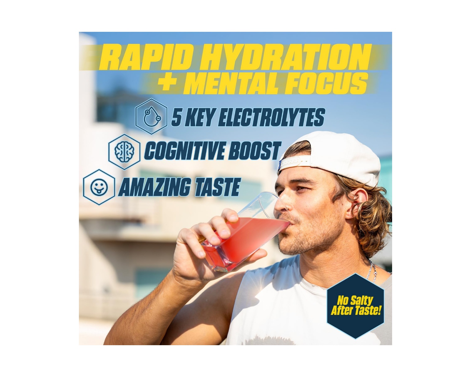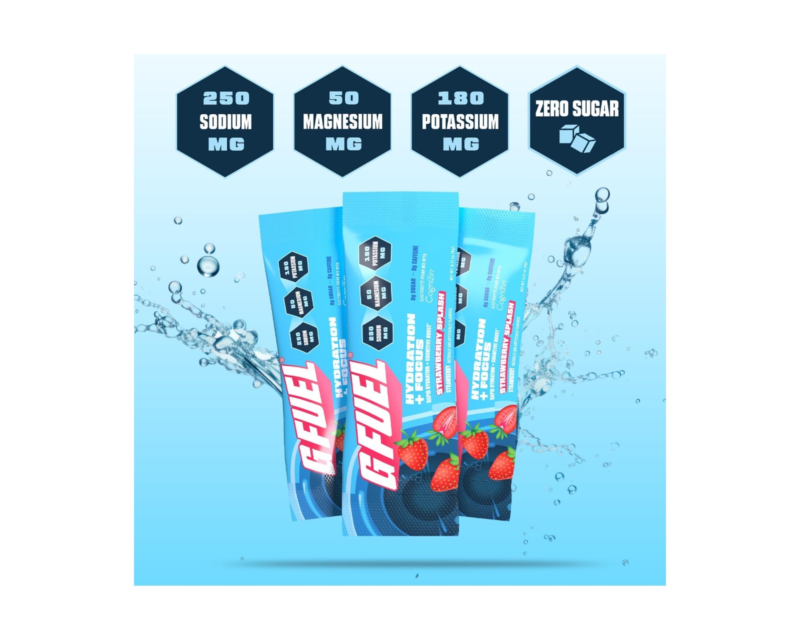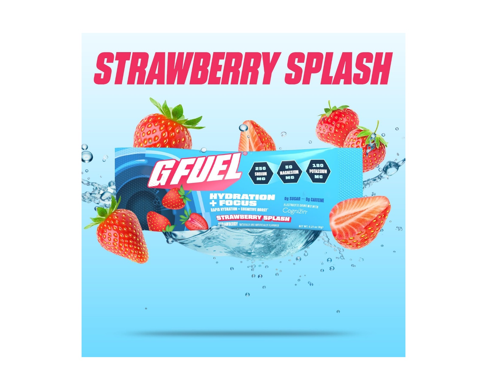 Jordgubbssplash Hydration + Focus Pack is an electrolyte powder from G Fuel that offers quick hydration and support for mental clarity. The product is sugar-free and has a strawberry flavor, making it a suitable drink for gamers and individuals who need extra focus during activities. Each package contains 20 servings.The product features an advanced blend of five key electrolytes, ensuring optimal hydration and clear mental clarity. The powder contains 250 mg of sodium, 50 mg of magnesium, and 180 mg of potassium per serving, effectively supporting brain capacity without a salty aftertaste. The powder is formulated with Cognizin to promote attention and memory.