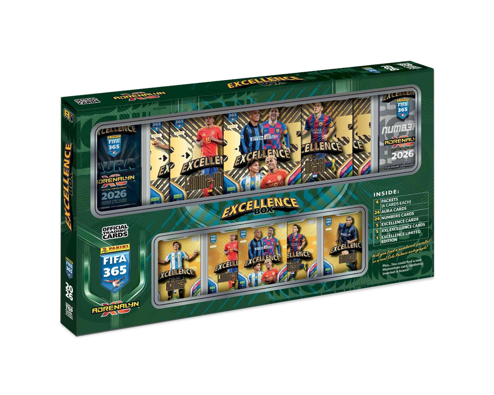 FIFA 365 Adrenalyn XL 2026 Excellence Box is a collector's box from Panini that contains cards related to football, including various celebrities and teams. This box is designed for collectors and football enthusiasts who want to expand their card collections with a mix of special cards and regular cards. The main components include 82 cards that are distributed in 4 exclusive booster packs with Aura cards, 4 exclusive booster packs with Numbers cards, 4 regular booster packs, and several Excellence cards. The box offers several special materials and subcategories that increase collectibility, including Limited Edition cards, parallel cards, and cards with authentic autographs. The cards are also numbered for added uniqueness. Each booster pack contains 6 cards, which totals 24 Aura cards and 24 Numbers cards. Additionally, it includes 5 exclusive Excellence cards and 5 XXL Excellence cards for those looking for something extra. Summary- Includes a total of 82 cards