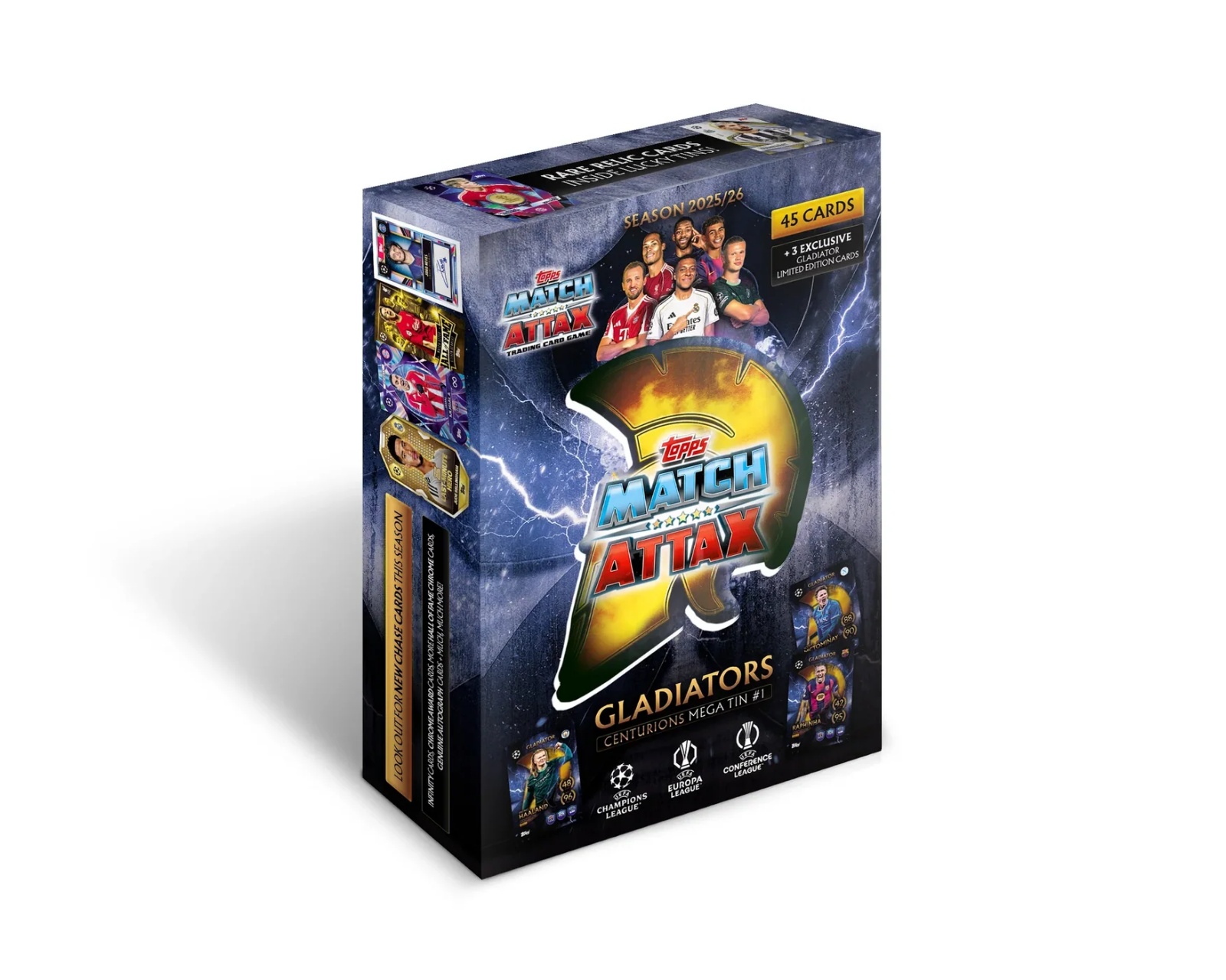 Match Attax Mega Tin UCL 25/26 is a collection of football cards from Topps that includes 45 cards from the UEFA Champions League, UEFA Europa League, and UEFA Europa Conference League. This collection offers 524 new cards, with categories such as Leaders, Cup Champions, Showboats, Magic Memories, Stealth Strike, and Counter Attack, as well as recurring elements like Heritage and Team Badges. The product is selected randomly upon ordering.It is built on robust quality and offers a varied range of cards, including rare variants such as Black Edge, Infinity cards, and Platinum Pull cards. The collection also includes unique Hall of Fame Chrome cards and Black Gold LE. Collectors can also discover new cards, such as the special Red Hot Yamal card and Ice Cole Palmer cards. Additionally, the offering includes relic cards that are exclusive to Booster and Mega Tins, as well as autograph cards like Lethal Combo Auto.