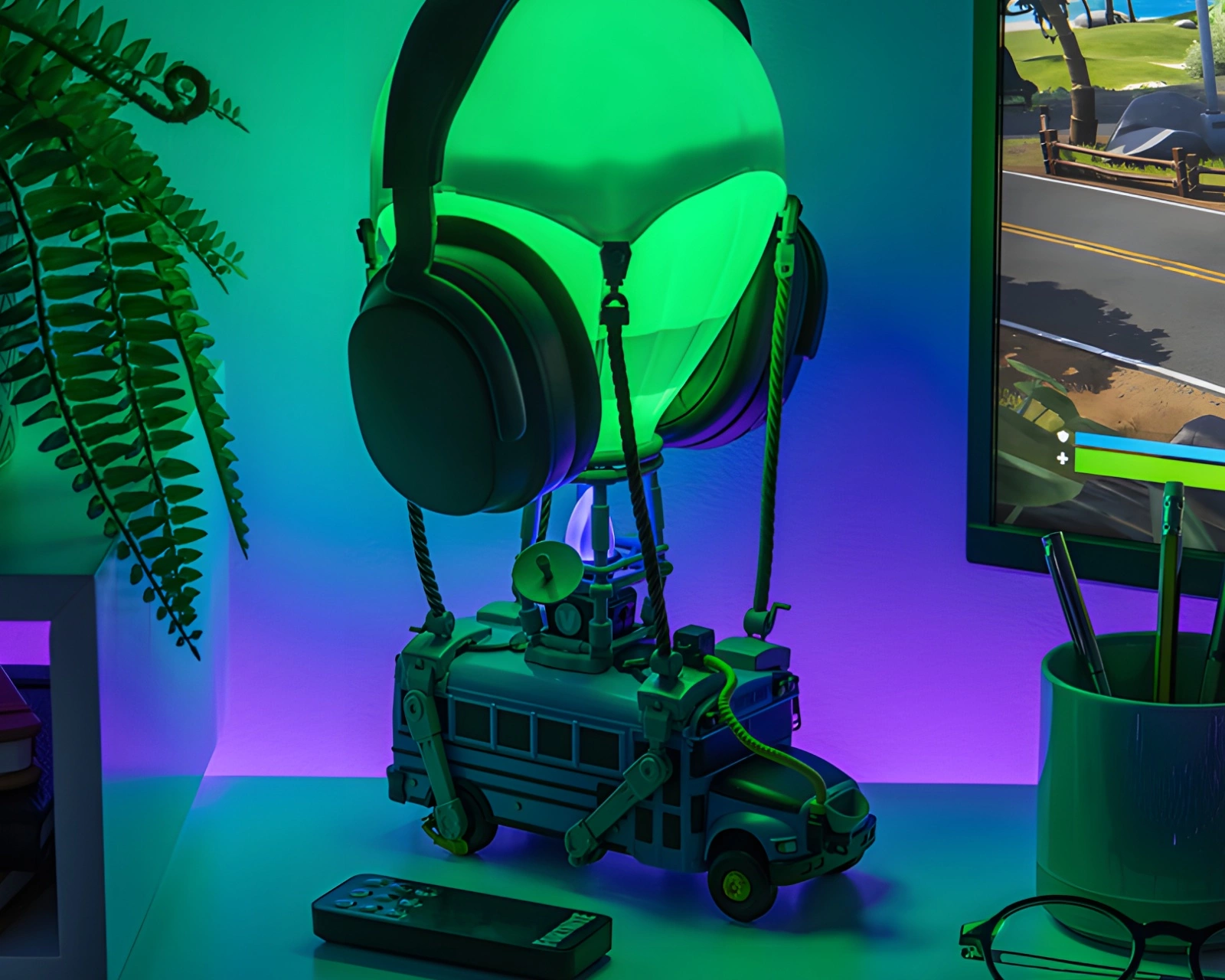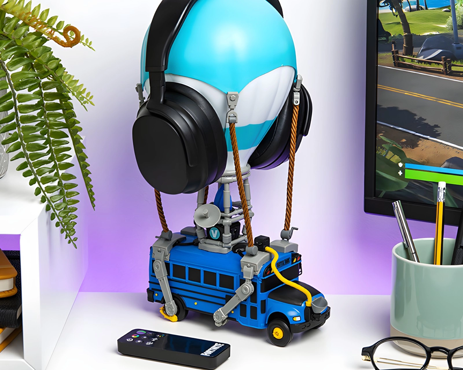 The Fortnite Battle Bus Diorama Lamp is a detailed reconstruction of the iconic vehicle from the game Fortnite. The lamp has three adjustable brightness levels and offers an interactive mode with music, making it ideal for gaming enthusiasts and children aged 6 and up. Measuring L 14.8 x W 19 x H 32 cm, it is perfect for both decoration and functional lighting in the home.The lamp's LED light can be adjusted to create different moods, making it useful both as a night light and as lighting during gaming nights. The interactive function with music adds an extra dimension of entertainment, while the color choices and variations allow the user to customize it to their liking. The lamp also has an integrated headphone holder to keep headphones or cables used during gaming organized. It is powered by a USB charging cable, which allows for easy connection to various power sources and makes the lamp convenient to use.