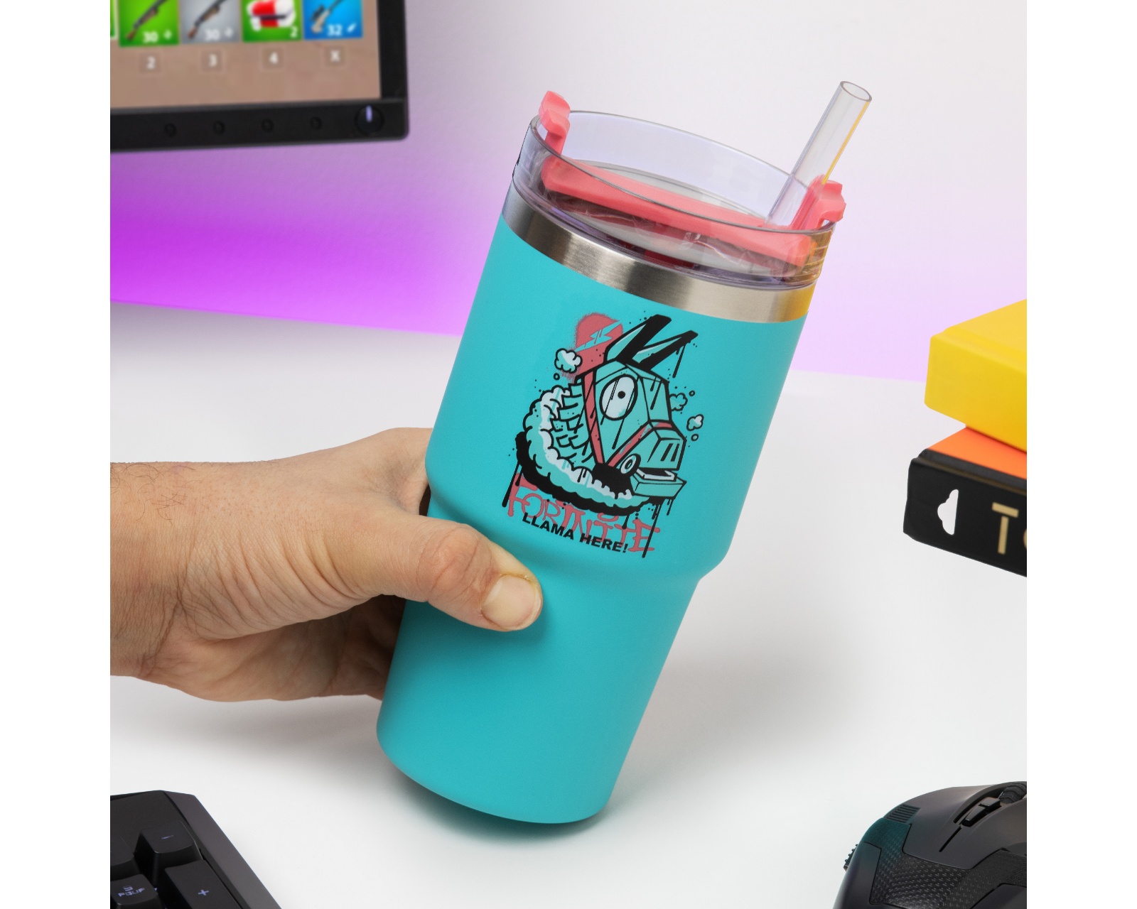 Stay refreshed during your gaming sessions with the Fortnite Gamer Cup. This stylish 600ml blue insulated mug keeps your drinks cold or hot for hours, whether you're taking a break or gaming non-stop. With its soft surface and sleek design, it's just as suitable for home or on the go. The slim base means it fits easily into standard cup holders.The lid's clever 3-in-1 feature offers a straw spout, a convenient sipping solution, and a closed top lid. Easily bring your favorite beverage and make game time even better. Hand wash recommended.
