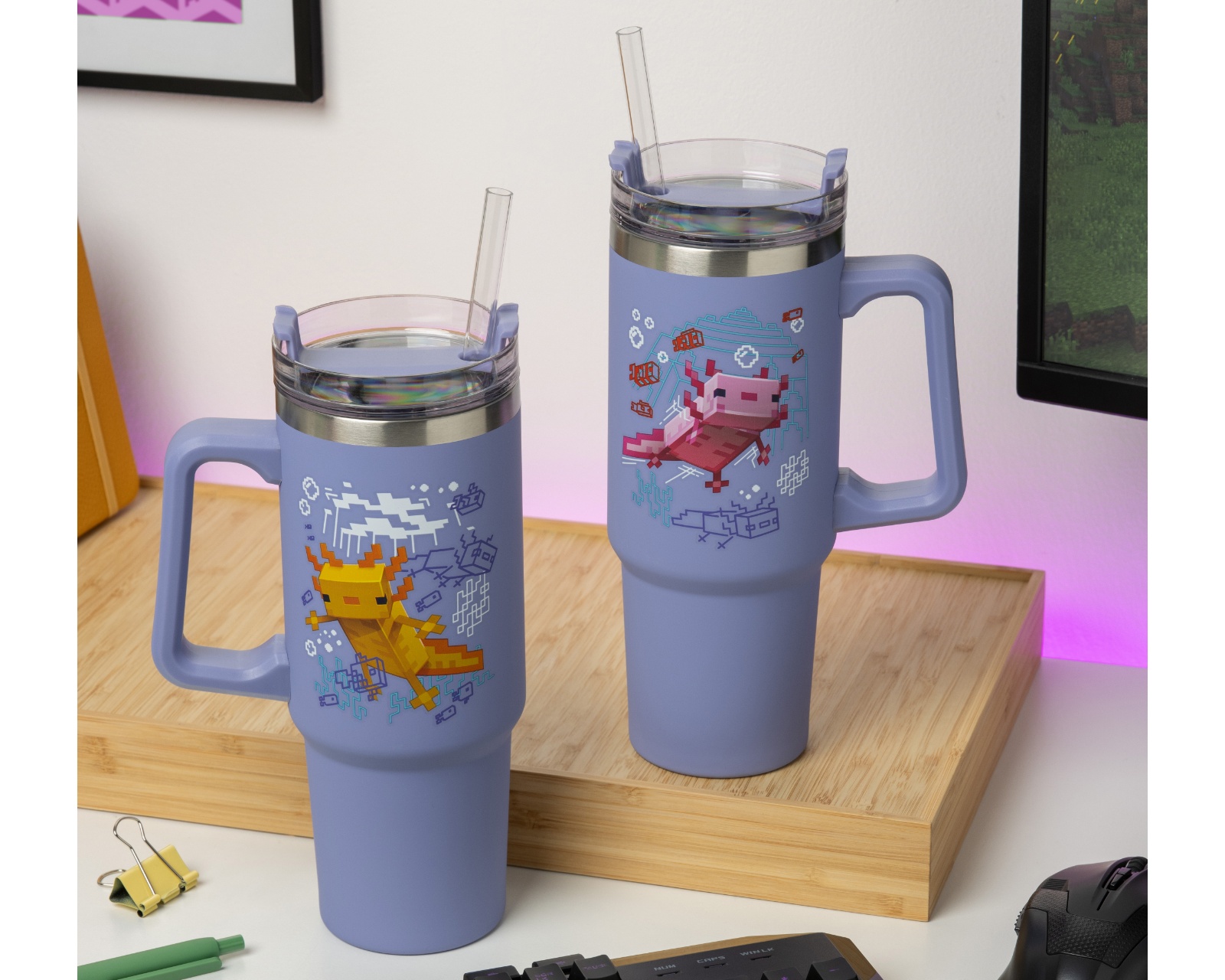 The Minecraft Tumbler Cup 900ml is an insulated drinking cup designed to keep your drinks cold or hot for a longer period of time. With a capacity of 900ml and a purple colour, this cup is both practical and stylish. It is perfect for gaming enthusiasts who want to keep their drinks close at hand throughout the day.The tumbler features an innovative three-in-one lid solution that includes a closed straw opening, an easy-to-reach sip design and a protective lid for on-the-go use. The practical handle is ergonomically designed to ensure a comfortable grip when transporting. The slim base means the cup fits perfectly in most car cup holders. Please note that the cup is not dishwasher or microwave safe and should be cleaned with warm soapy water to preserve the decor.