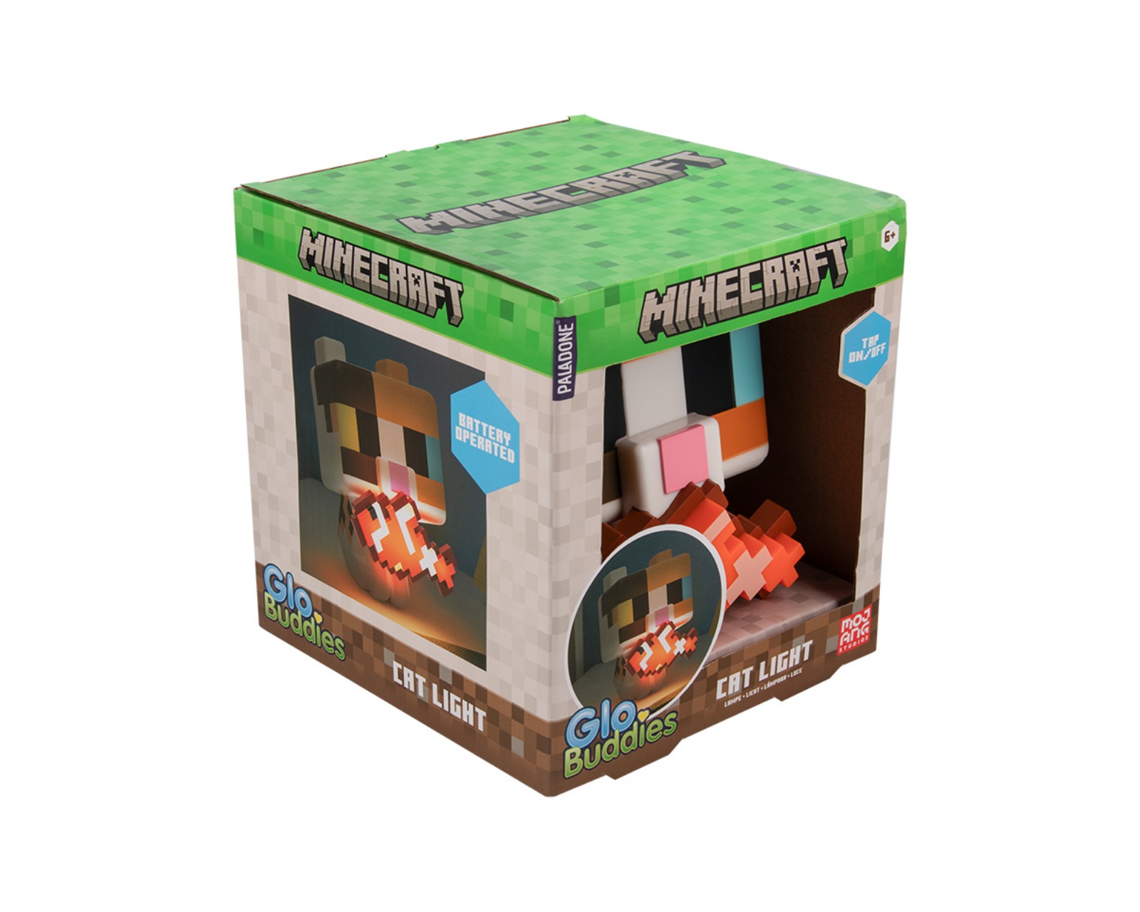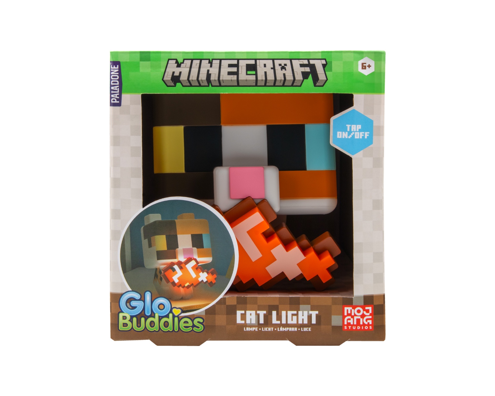 Minecraft Cat GloBuddies Lamp is a decorative lighting from Paladone that brings life to your space. This 3D figure stands 15 cm tall and represents the popular game's calico cat with a charming, glowing fish in its mouth. It is easy to use; press to turn on and press again to turn off. The lamp is powered by 2x AA batteries (not included), which means no wires are required to turn on the lighting.The Minecraft Cat GloBuddies Lamp is ideal as a nightlight and fits perfectly on desks, shelves, or nightstands. The figure is carefully designed to mimic the game's graphics, making it an excellent accessory for both gamers and Minecraft enthusiasts. The lamp provides a soft, warm glow that creates a pleasant atmosphere in any room. With its compact size, it is easy to place and can uplift the mood in your home.