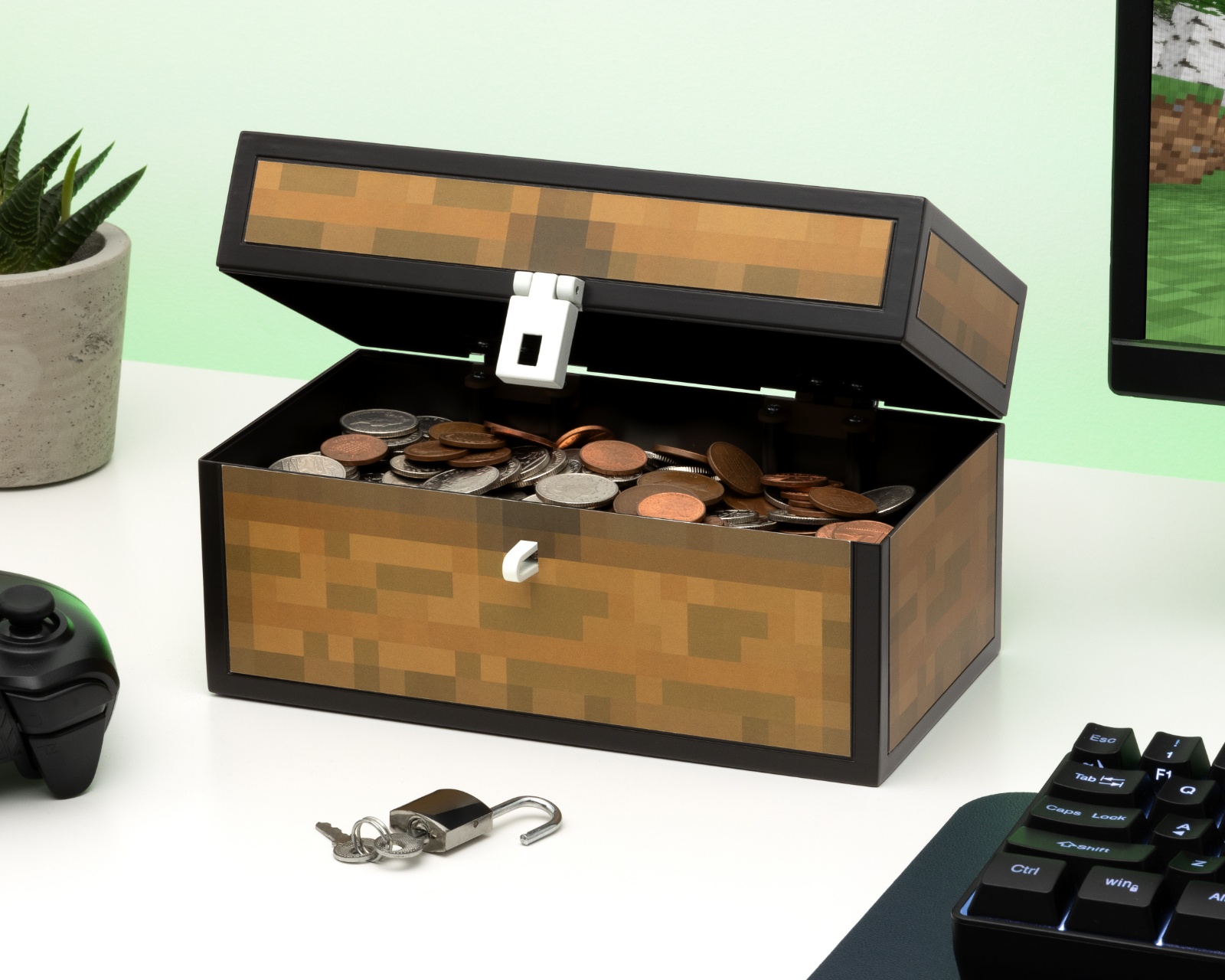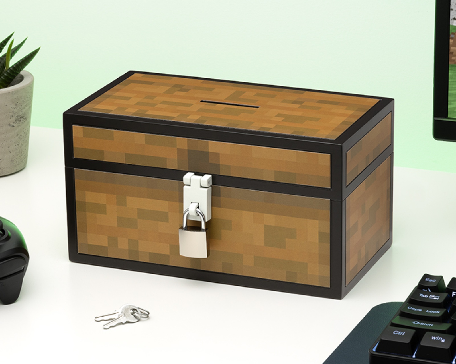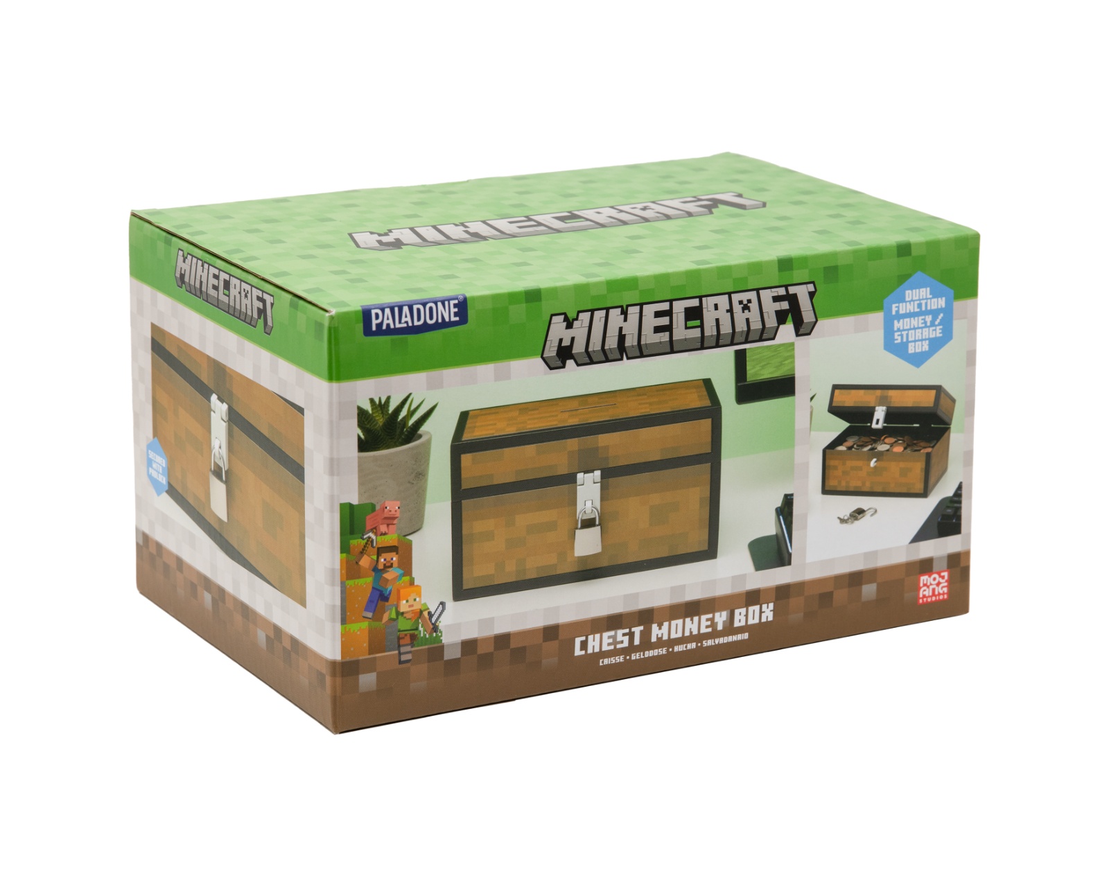 Minecraft Chest Money Box is a piggy bank inspired by the popular game Minecraft. It has a height of 12 cm and is made of plastic, making it lightweight and durable. With a provided lock, you can secure your pocket money like a vault in the Overworld. It is ideal for block-builders and crafters who want to save for their next adventure.The product is designed with a set of specifications that make it easy to use and functional. It has a weight of 0.3 kg, making it portable and easy to handle. The versatile design allows it to be used by both children and adults, contributing to its broad appeal.