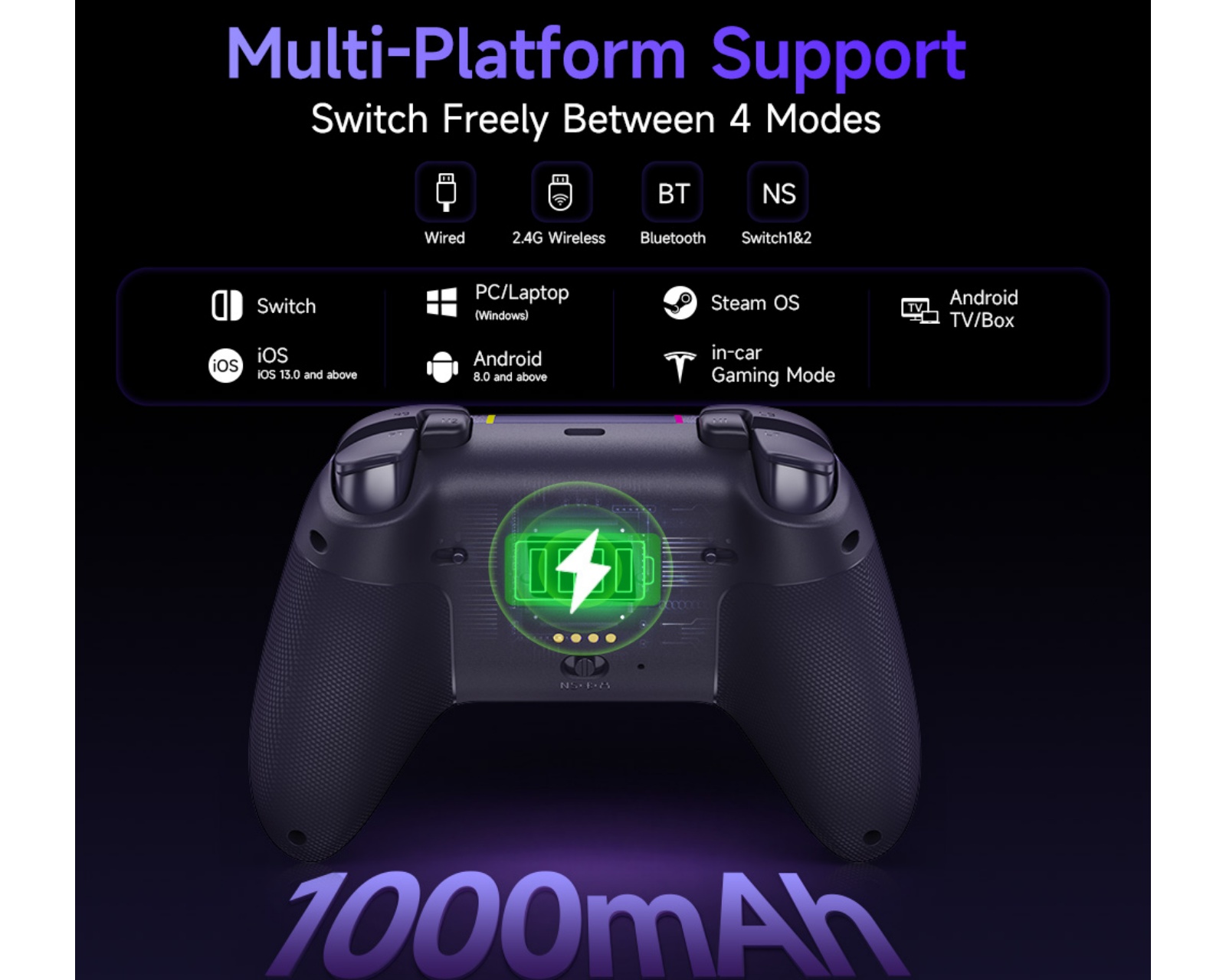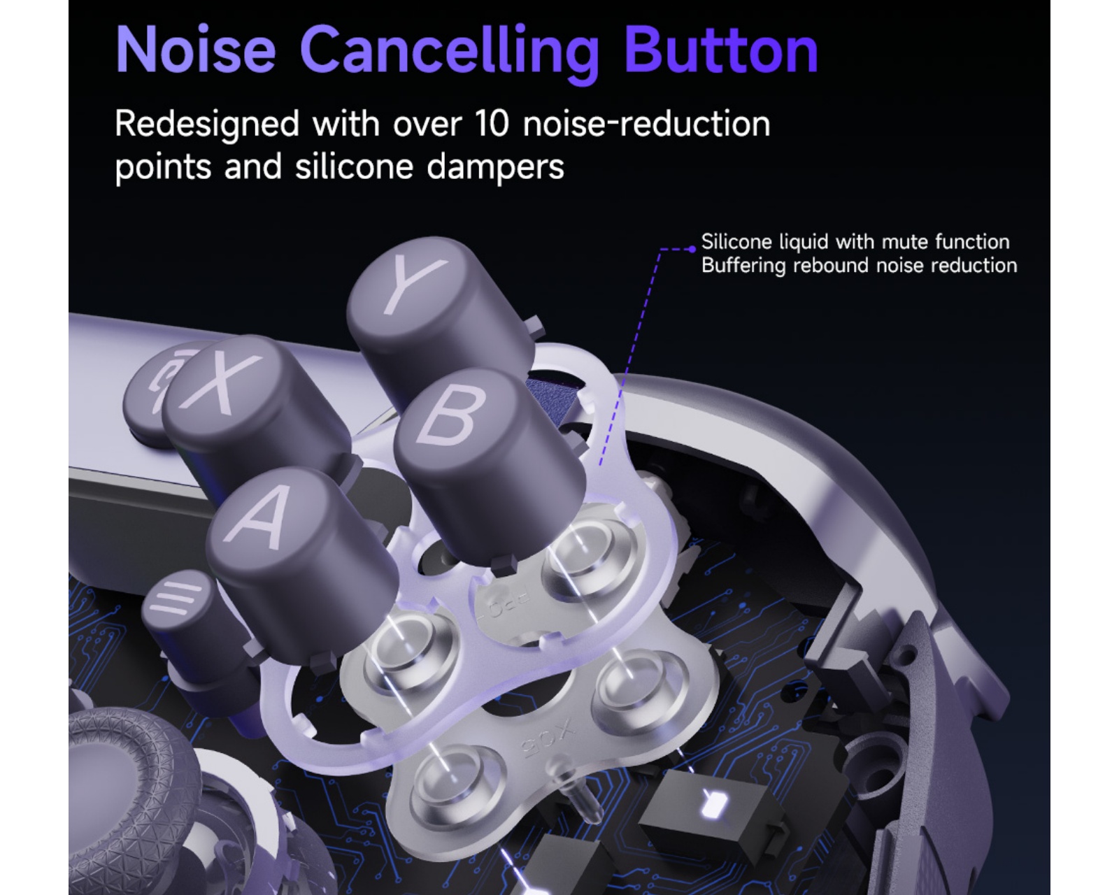 EasySMX X05Pro is a wireless gaming controller that supports multiple platforms. It is specifically designed for use with PC, Nintendo Switch, and mobile devices. The controller features sound-dampening buttons for quiet gaming experiences and offers an advanced dual-stage hall trigger mechanism for increased precision in gaming control. It is built with high-quality materials and integrates Hall-effect joysticks that allow for long-lasting and responsive usage.In addition, it offers an 8-way D-pad for precise direction and execution of combinations, as well as an upgraded vibration system for improved feedback during gameplay. The controller also supports RGB lighting with customizable colors for a personal touch.