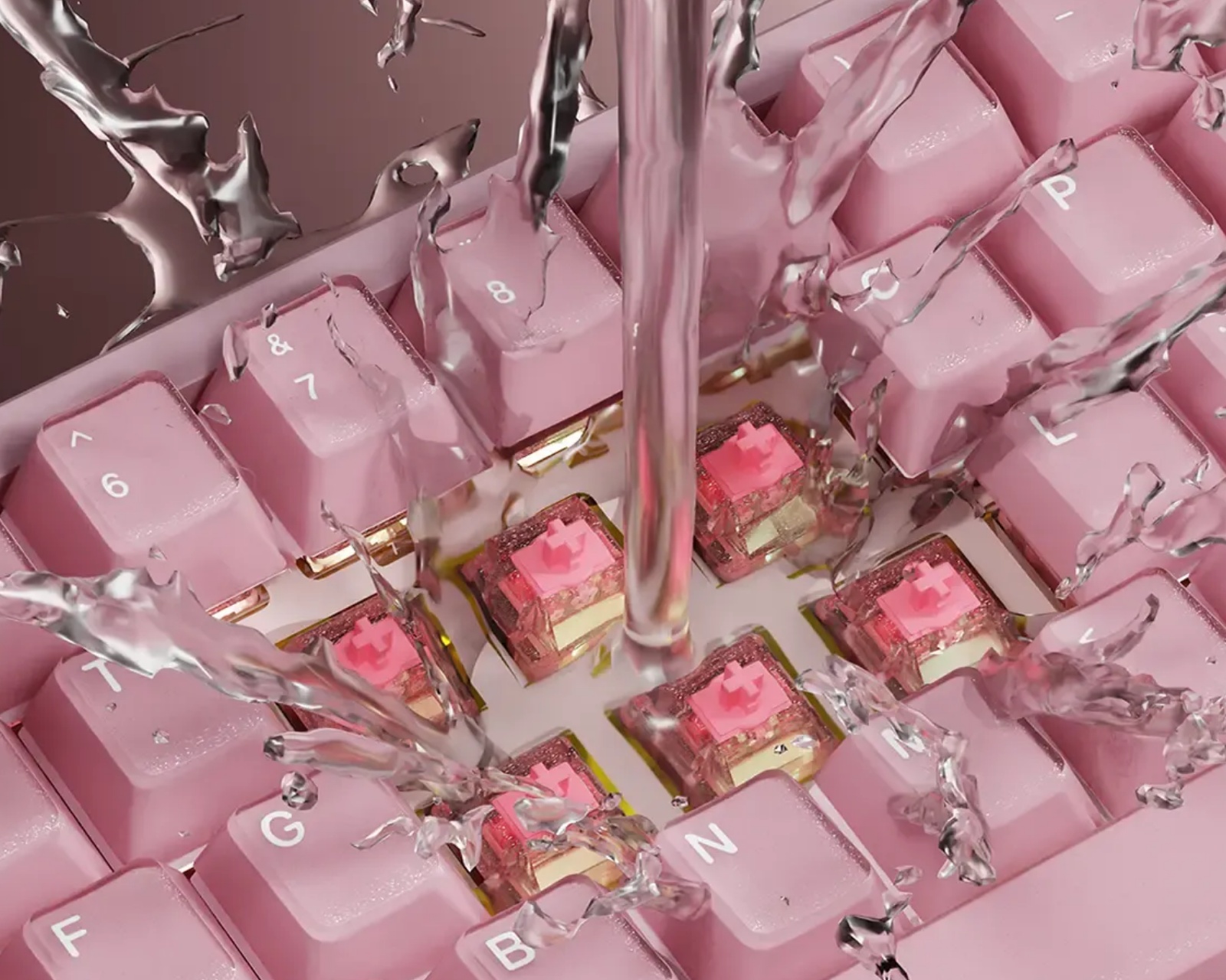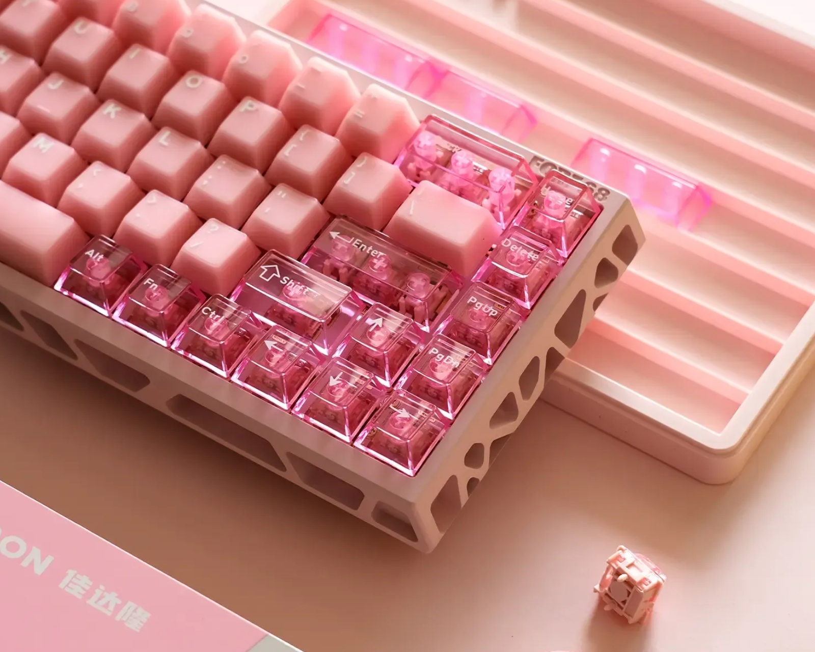 GATERON FORT 68 Sakura is a 68-key mechanical keyboard kit from Gateron, designed with a real-time optical system and magnetic switches. The keyboard offers a pre-assembled layout with a tri-split modular spacebar for enhanced interactivity and customizability. It responds instantly to input with light effects, providing a multifaceted typing experience.The keyboard is equipped with a patented tri-split design that enables modular flexibility and stability. The magnetic switch features improved feedback with quick rebound, which is beneficial for gamers. Furthermore, the keyboard is protected with a nano-scale waterproof module, making it spill-resistant. The latency is exceptional with an accuracy of 0.01ms and a latency of < 0.125ms for smoother usage.
