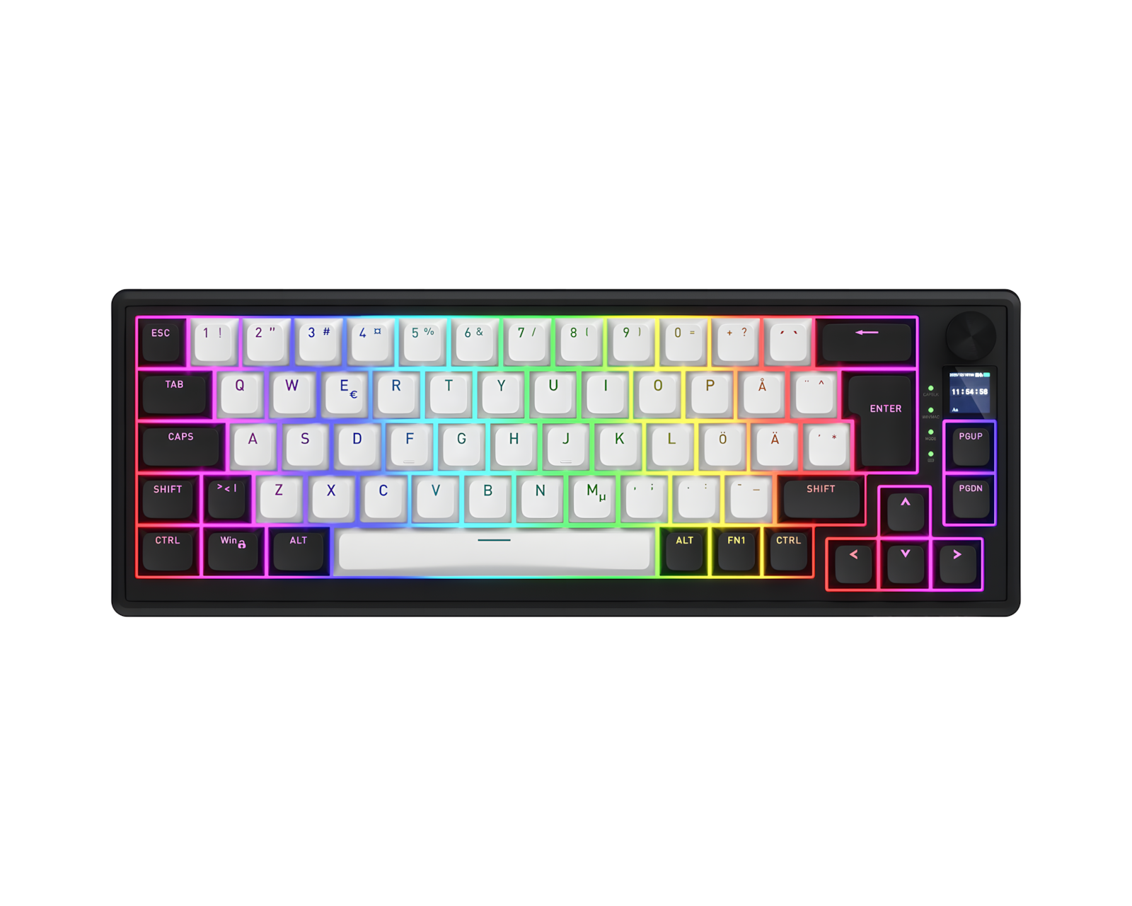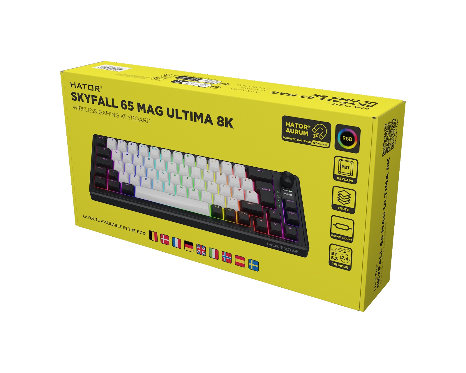 Skyfall 65% MAG Ultima 8K is a wireless keyboard from Skyfall that combines high performance with customizability. Featuring magnetic Aurum Ice switches, every key press is registered with precision, allowing the activation point to be adjusted individually for each key. It also offers a polling rate of up to 8000 Hz, minimizing delays in key press registration. The packaging also includes extra keycaps for the ISO layouts: DE, Nordic, IT, ES, FRA and BE.The keyboard's construction is gasket-mounted and includes multi-layer sound dampening, providing a controlled bottom-out and reducing resonance. The flexible tri-mode connectivity via USB, 2.4 GHz, or Bluetooth ensures stable and fast feedback. Digital components and a TFT screen provide quick access to settings, while the customizable RGB lighting offers visual indications for each key. Additionally, the keyboard supports hot-swapping of switches, making adjustments easy without the need for soldering.