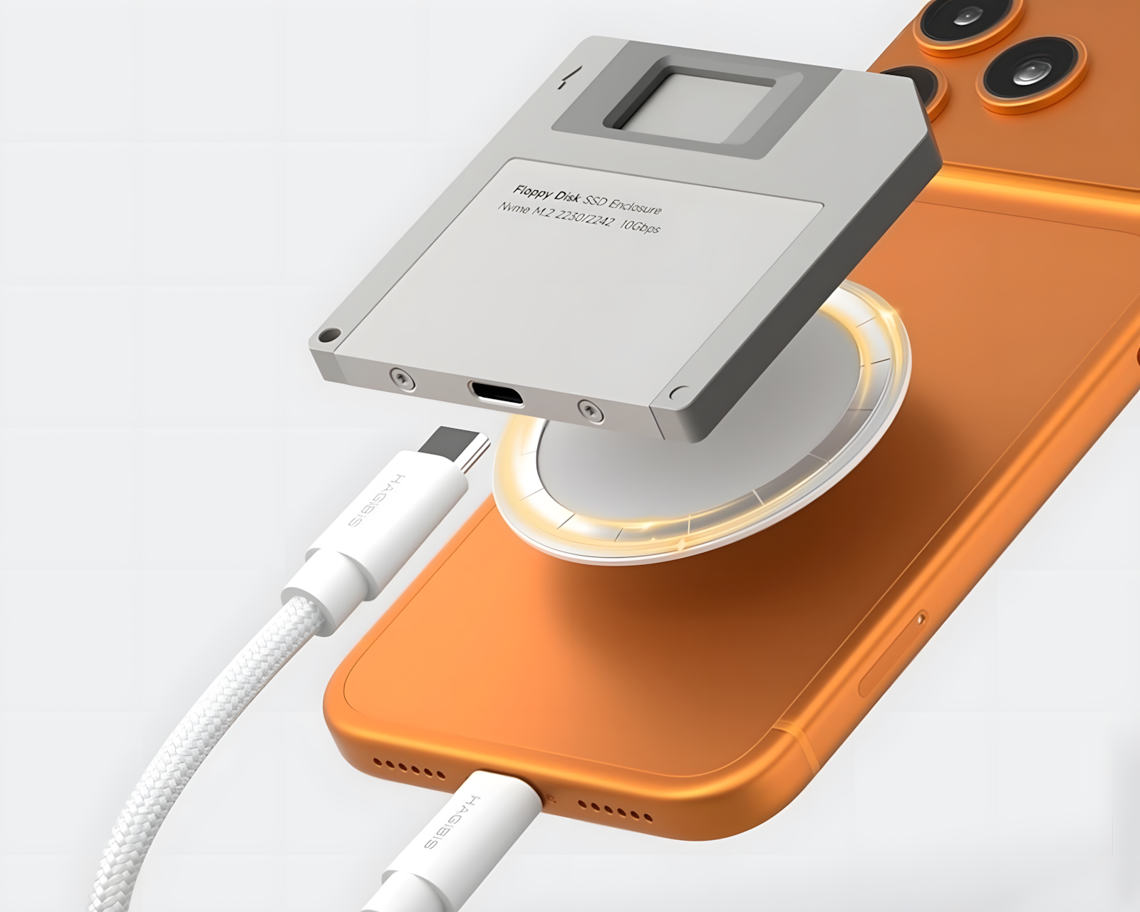 An external SSD enclosure inspired by the design of floppy disks from the 90s. The nostalgic design reflects a time when technology was more analog, while still offering modern performance and convenience. With a USB3.2 Type C interface, this device enables a transfer speed of up to 10 Gbps, ensuring fast data transfer and backup solutions. When an NVMe SSD is installed, read and write speeds can reach an impressive 1000-1200 MB/s, allowing large files, such as HD movies, to be transferred in just two seconds.Built to support M.2 2230 and 2242 NVMe SSDs with B+M Key or M Key, the Hagibis case offers easy plug-and-play functionality. It is designed to be both compact and lightweight, with a thickness of only 6.1 mm, making it easy to carry in a pocket or backpack. The new 9210CN chip provides high performance and high compatibility while reducing power consumption, ensuring the safety of your data. Note that only SSDs with single-sided components and a thickness of less than 2.5 mm are supported.