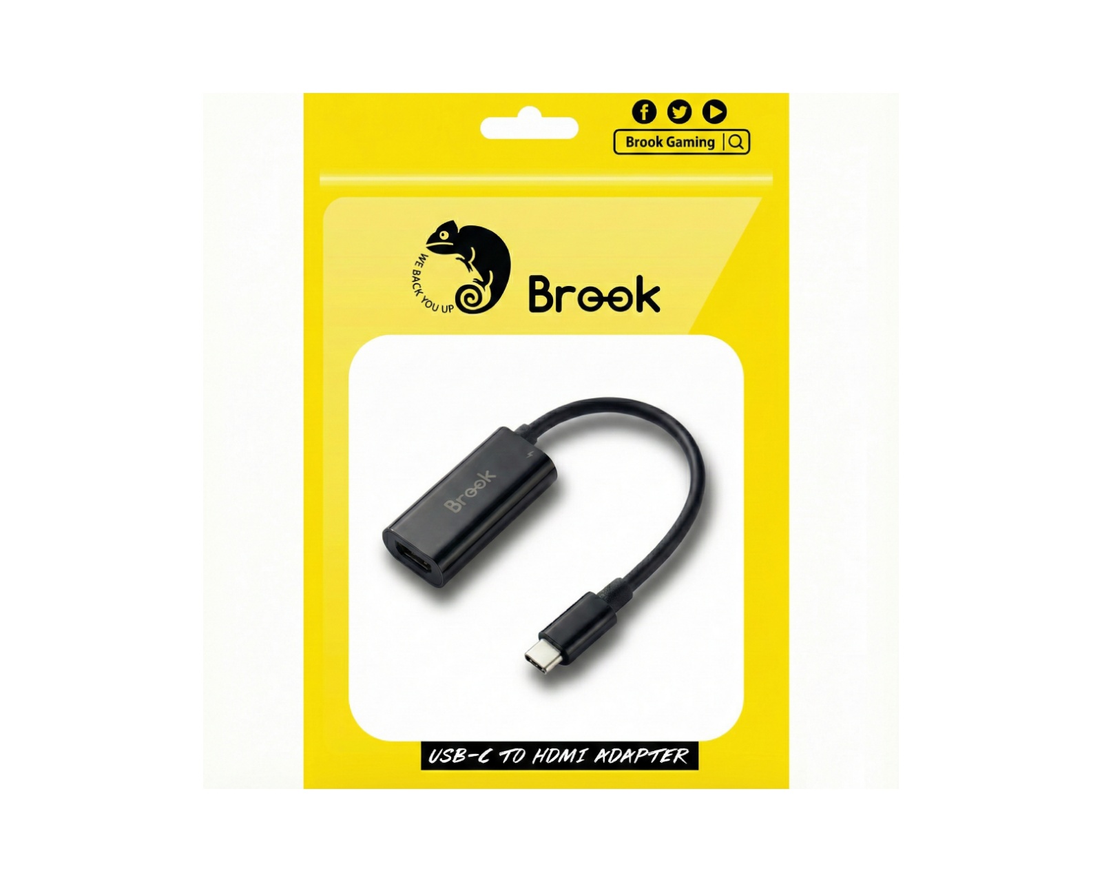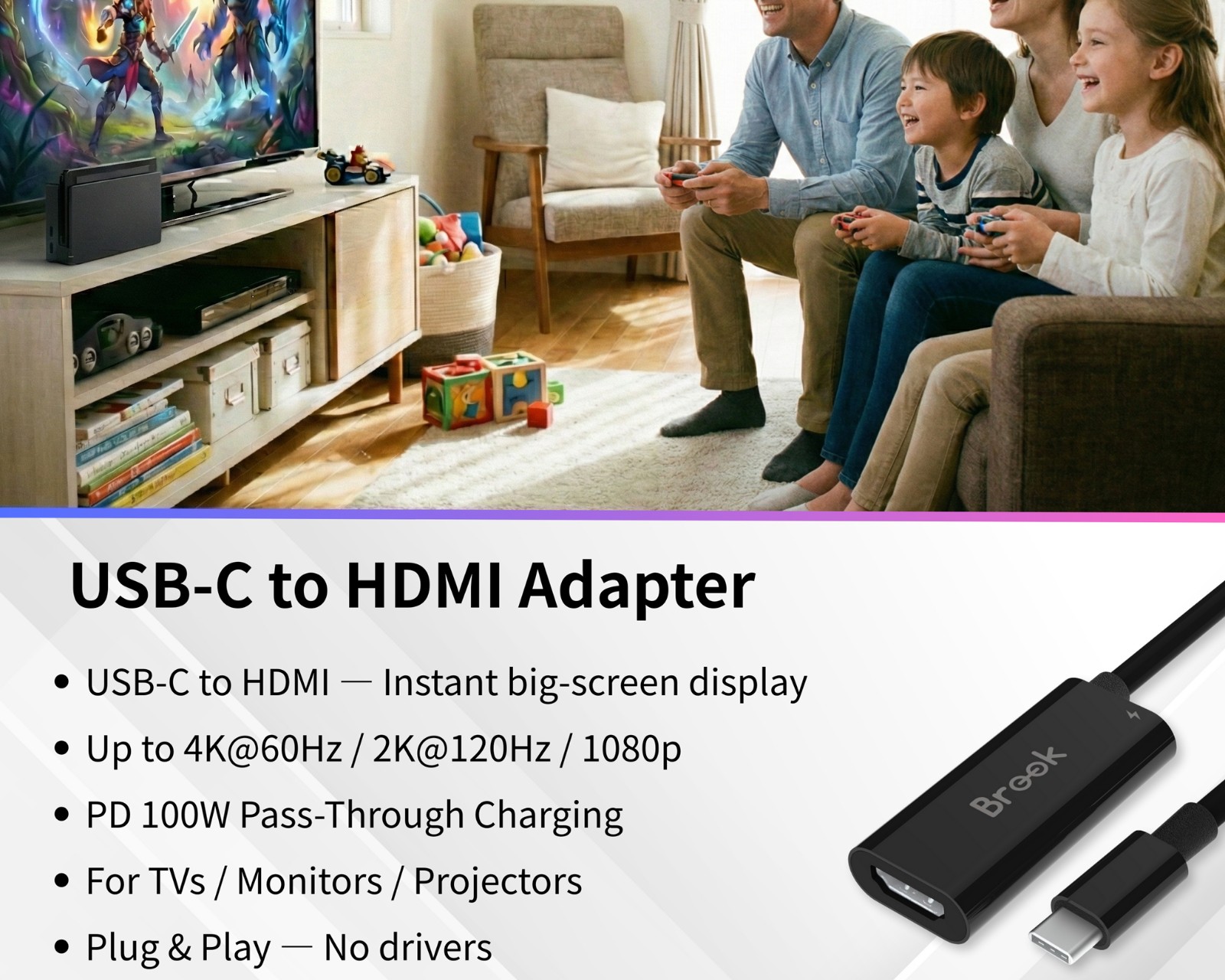 USB-C to HDMI Adapter from Brook, designed for easy and efficient connection between USB-C devices and HDMI displays. With support for resolutions up to 4K at 60Hz, 2K at 120Hz, and 1080p, this adapter offers sharp and clear image quality. It is ideal for use with TVs, monitors, and projectors, making it a versatile tool for both gaming and multimedia. The adapter's plug-and-play functionality makes installation seamless and without the need for additional drivers.The adapter's construction is robust and optimized for high data transfer speed, ensuring that you get the best possible viewing experience. With a PD 100W pass-through charging feature, you can charge your devices while using the adapter, eliminating the need for multiple cables. This makes it a practical choice for mobility and user-friendliness. Designed to be compact, it is easy to take with you and perfect for both home use and when you're on the go.