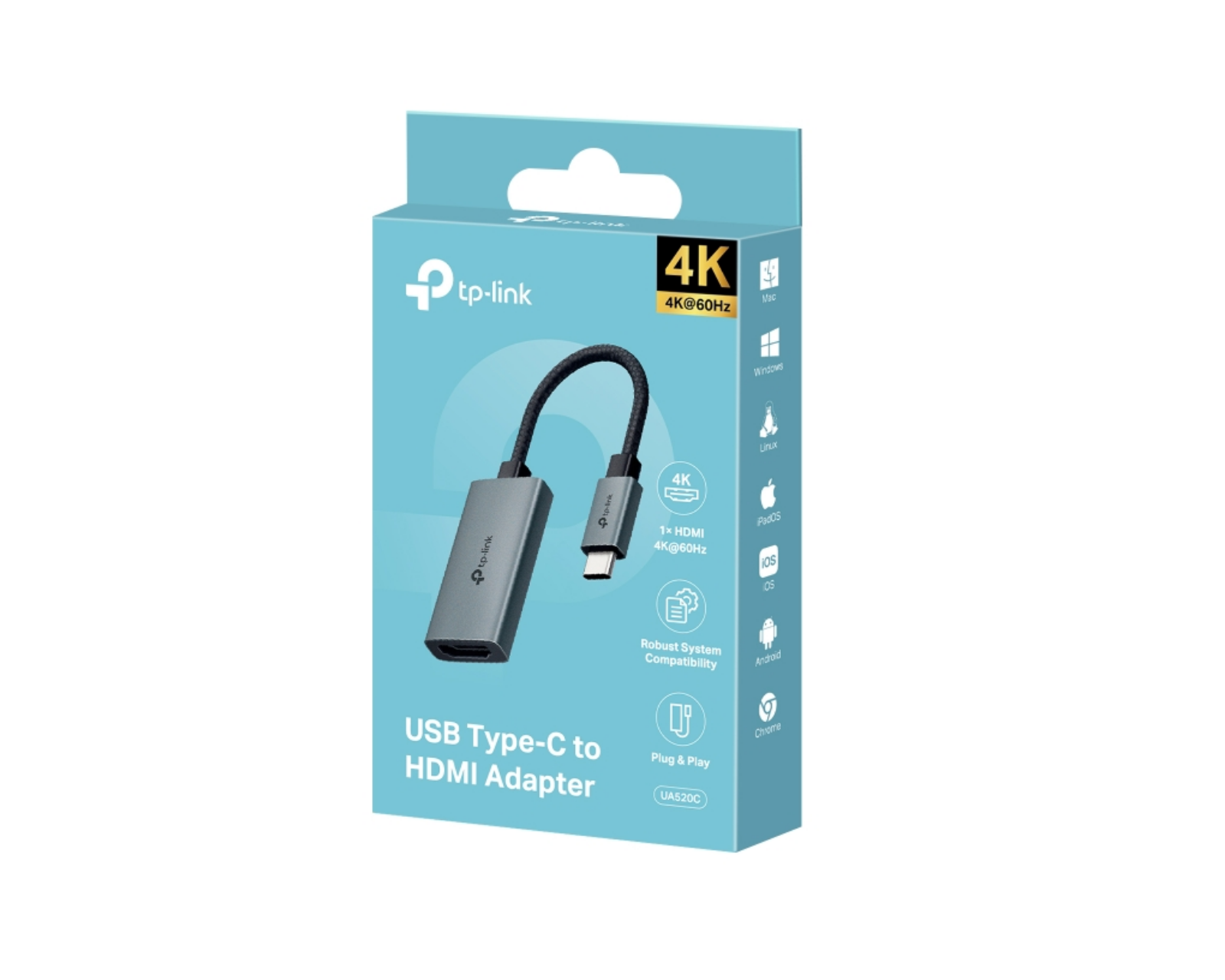 UA520C USB Type-C to HDMI Adapter from TP-Link, designed to easily connect devices with USB-C to HDMI. With support for MacBook Pro and iPad Pro, this adapter provides a seamless transition between the USB-C port and an HDMI connection, without the need for additional installation. It is compatible with multiple operating systems, including MacOS, Windows, iPadOS, iOS, Android, Linux OS, and Chrome OS.UA520C is built with a flexible 100 mm braided cable, allowing you to free up important port spaces on your devices for better usability and performance. The robust aluminum alloy casing and the braided cable ensure durability while the compact design makes it easy to transport. UA520C meets the demands of today’s users and guarantees that you get both a sustainable and practical solution for HDMI connection.