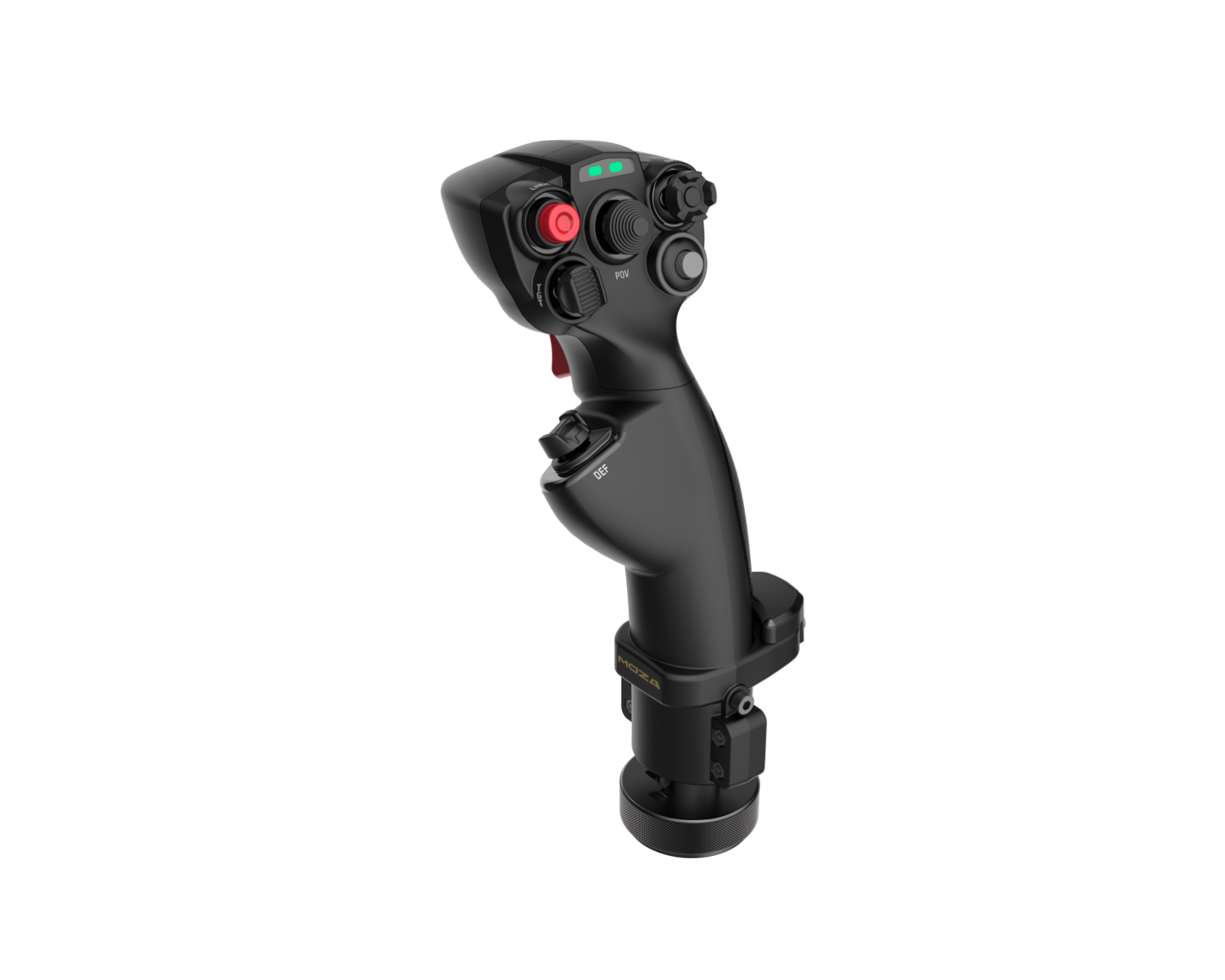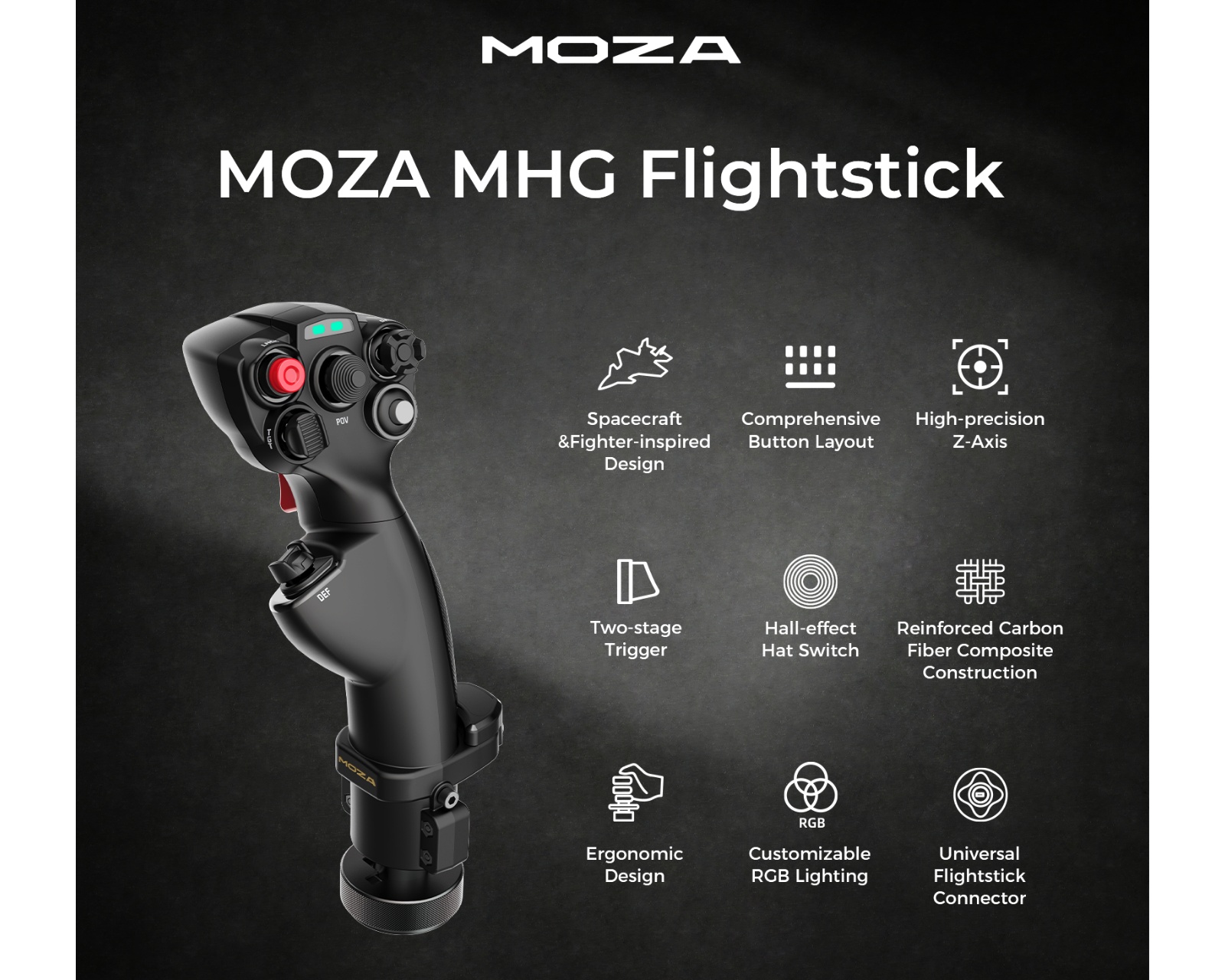 MHG Flight Stick is a high-performance flight stick from Moza Racing, designed for sim pilots and space game enthusiasts who want a deeper experience and improved control through force feedback. It is inspired by spacecraft and fighter jets, and offers an intuitive and comfortable grip design that enhances the flying experience. With a complete set of buttons and switches, users can easily customize their controls to over 25 virtual inputs through MOZA Cockpit.MHG's robust construction in high-quality carbon fiber reinforced composite material ensures durability during demanding use. With a precise Hall-effect sensor for the Z-axis (roll) as well as a two-stage trigger for increased control during combat situations, it offers both feel and precision. The ergonomic design and textured surface prevent slipping during extended use. Additional features include customizable RGB lighting and a universal connection that makes it compatible with all MOZA bases.