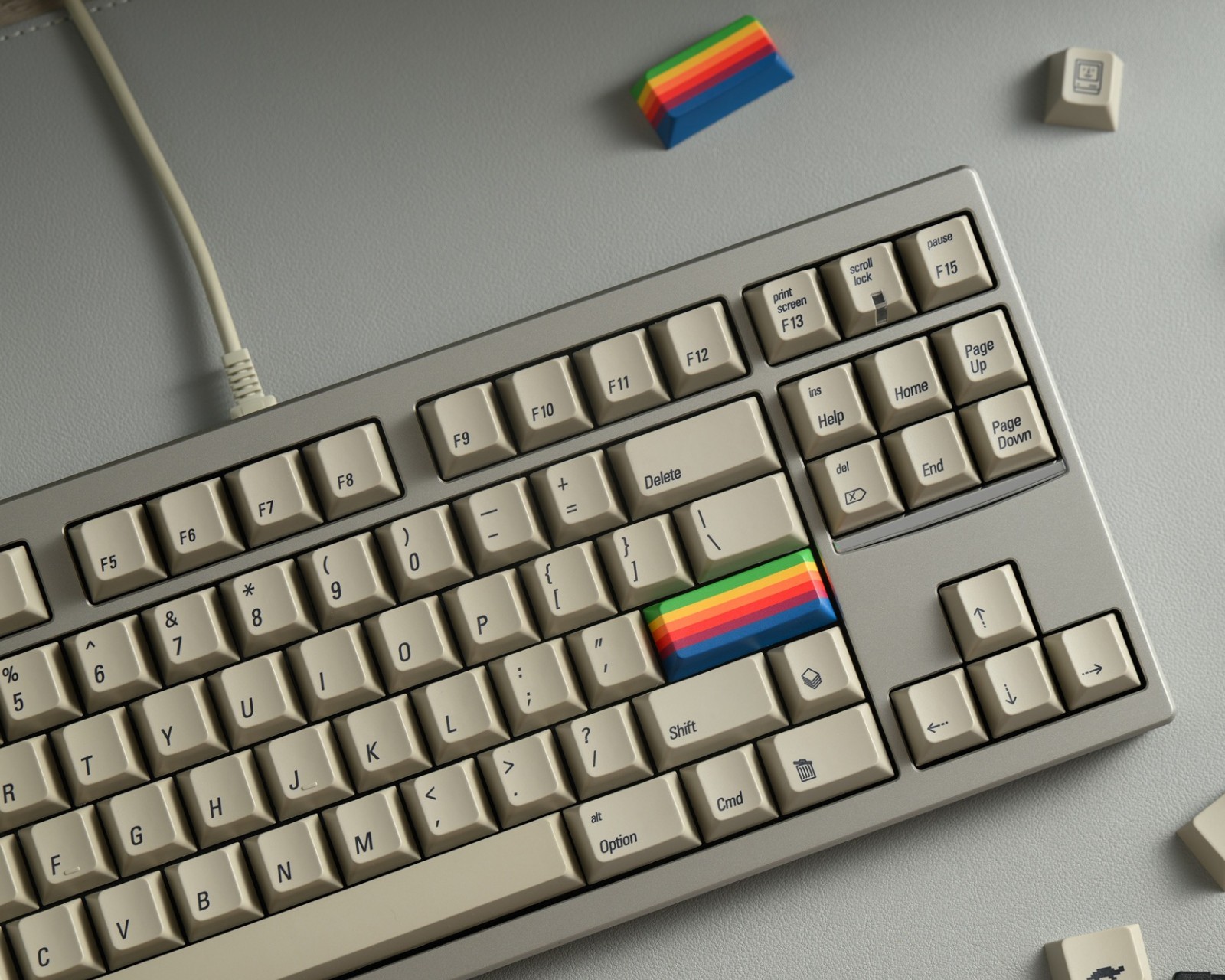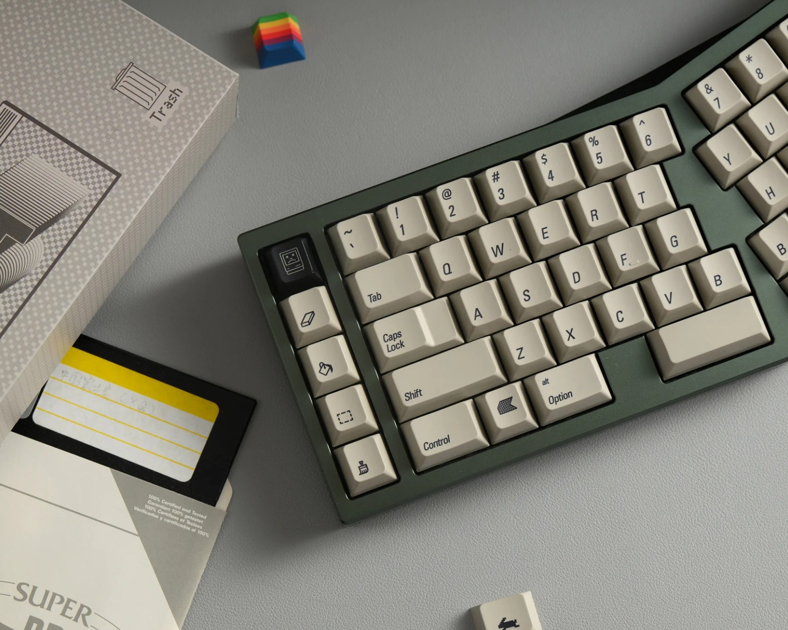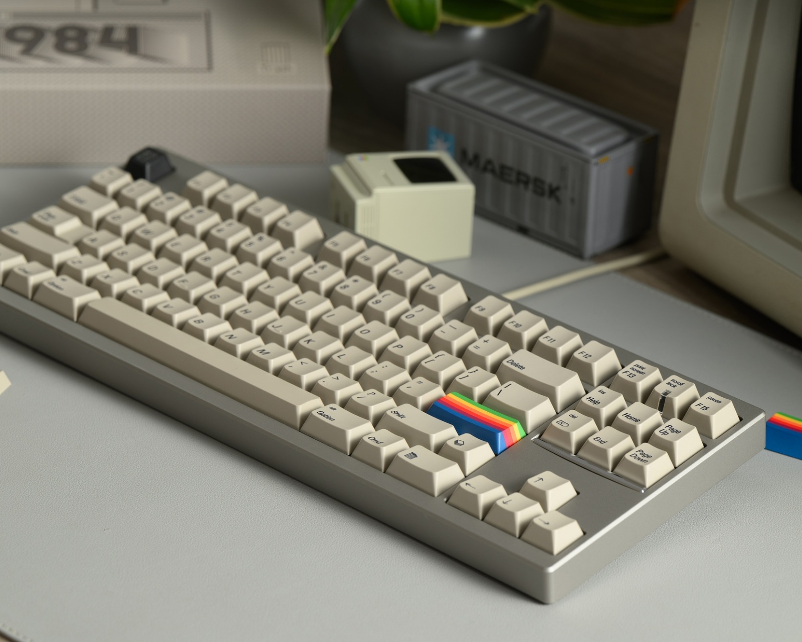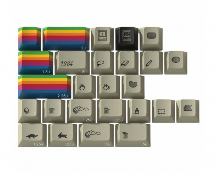 PBTfans 1984 is a novelty keycap kit from PBTfans that offers a unique sound experience. Made from PBT material with glass microspheres, these keycaps provide a clear and crisp sound quality. The product has a Cherry profile and is designed to be compatible with Cherry MX switches and MX-style clones.The keycaps have a thickness of about 1.3 mm, contributing to durability and providing a distinct feel. The outer texture of the keycaps is designed to mimic the feel of skin, which differs from products with a dual-color surface. The manufacturing process includes dye-sublimation, enhancing wear resistance and ensuring the design remains intact over time. The keycaps come in an ABS keycap tray with a specifically designed tray that protects them. It is also worth mentioning that only keycaps are included in the package, no keyboard is included.