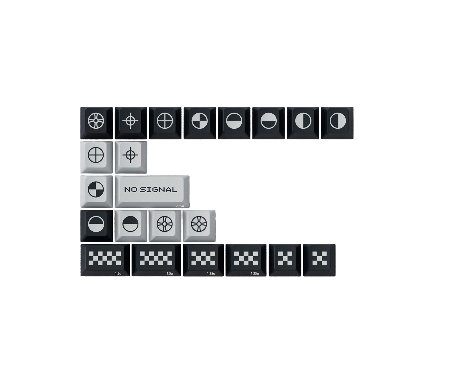 PBTfans No Signal is a novelty set from KBDfans inspired by electronically generated test patterns historically used to calibrate televisions. The kit includes keycaps made of PBT material and is compatible with Cherry MX switches as well as MX-style clones. Key elements of the design reference iconic test patterns such as the Indian-head test pattern and SMPTE colors, giving the keyboard a unique visual aesthetic with clear graphic elements. Please note that only keycaps are included; no keyboard is provided.PBT material ensures durability and resistance to wear, and the Cherry profile offers a familiar feel for the fingertips. The keycaps are made using dye-sub and reverse dye-sub methods, which ensure that the pattern remains sharp and consistent over time. It comes in an ABS keycaps tray with a designed tray cover that makes it easy to store and protect the components.